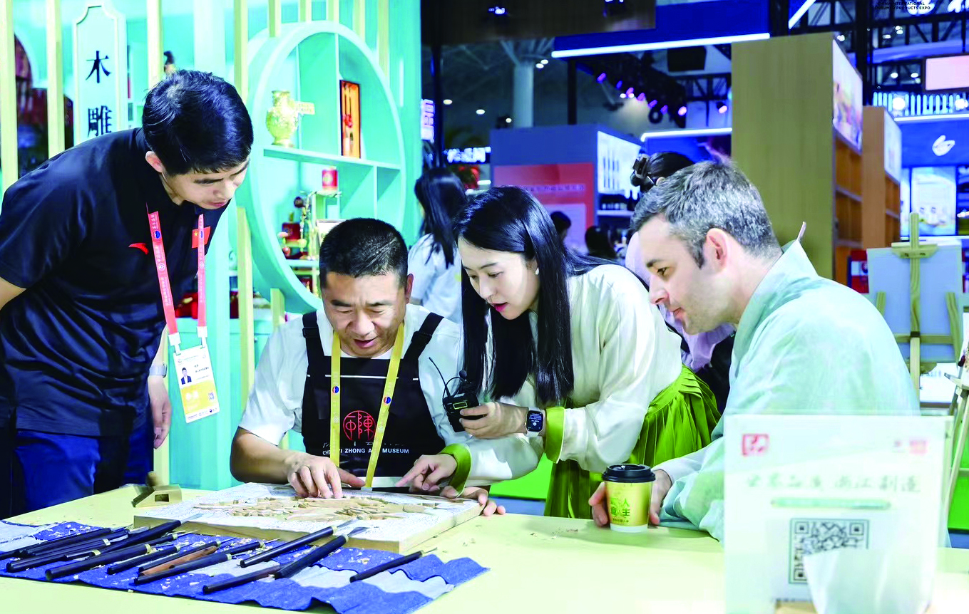 记者 冯俊江 通讯员 吴海棠 近日,第五届中国国际消费品博览会在海南举行,位于东阳经济开发区木雕小镇的陈一中创作室携5件精选木雕台屏作品亮相。 参展作品主要以传统东阳木雕技艺为根基,融入现代审美,当中既有寓意花好月圆的《国色天香》,又有曾获浙江省特色伴手礼殊荣的《松鹤迎宾》等。 展会期间,浙江省工艺美术大师陈一中现场执刀雕刻,展现了国家级非遗的细腻刀法与文化魅力,成为展会亮点。