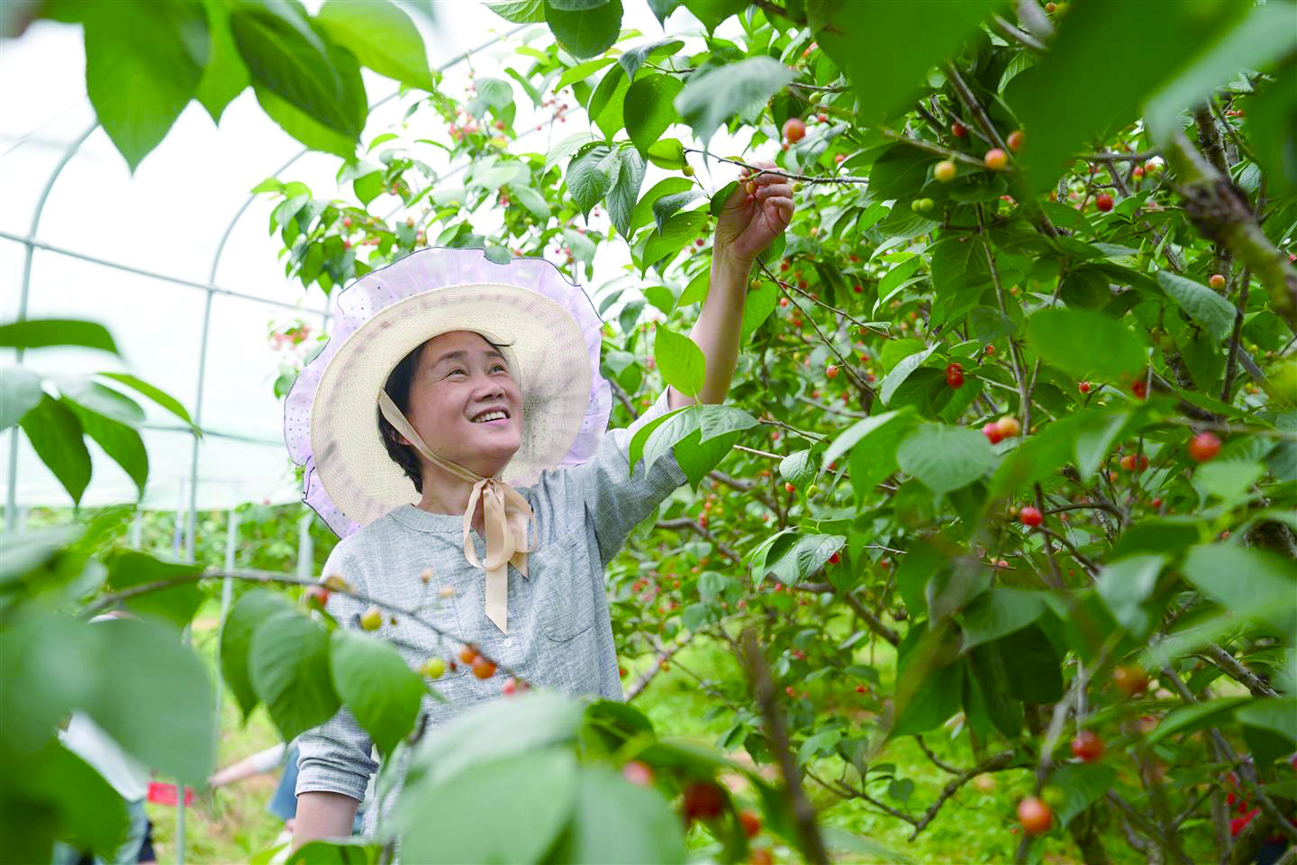 记者 包涵 文/摄 暮春时节,樱桃红透枝头。东阳六石街道蟠松村的蟠松樱桃园迎来一年中最热闹的采摘季,20多亩果园内千株樱桃树硕果累累。 短柄樱桃与黑珍珠樱桃两大品种相继成熟,吸引义乌、永康、浦江等周边地区游客纷至沓来,体验“田园采摘+亲子互动”的春日乐趣。