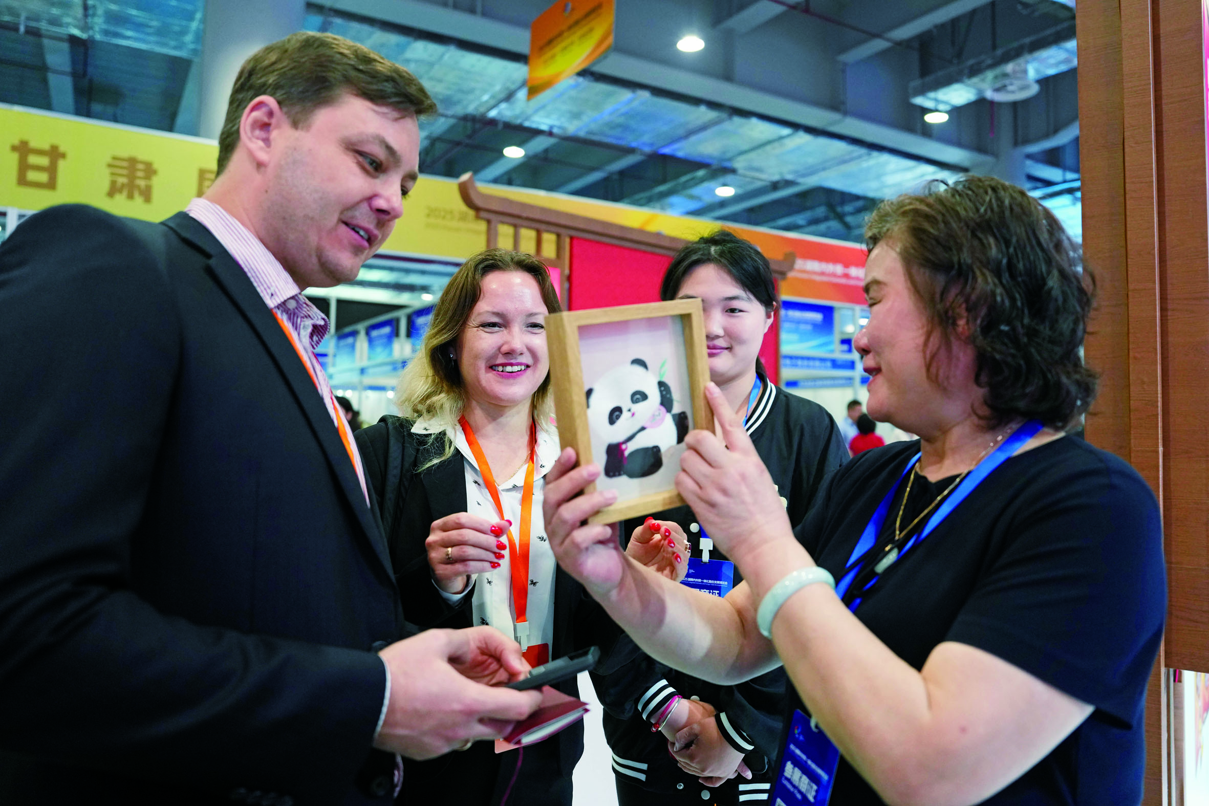 4月27日,采购商(左一、左二)在活动现场向参展商了解湘绣技艺。 当日,“2025湖南内外贸一体化融合发展博览会暨外贸优品中华行湖南站”在湖南株洲国际会展中心正式启动。 新华社发