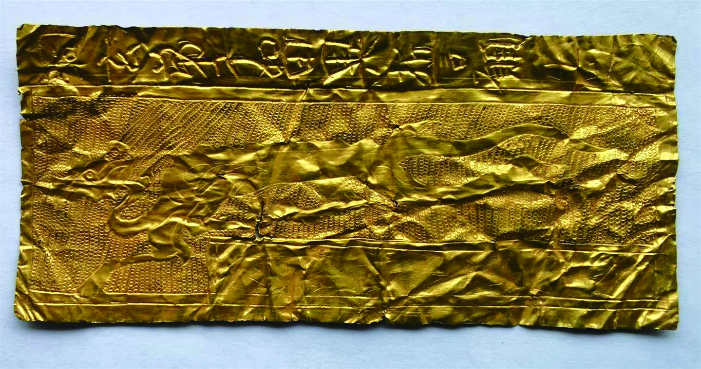 左部的龙纹,图、底有些混淆,经仔细辨别,它体现的还是一种早期风格的“走龙”形象。细鳞状的纹样并非龙身,空白处才是。龙身朝前,龙尾似虎尾刚劲有力。笔者曾将图发给省博物馆投龙展策展人魏祝挺老师请教,他的看法也一致。