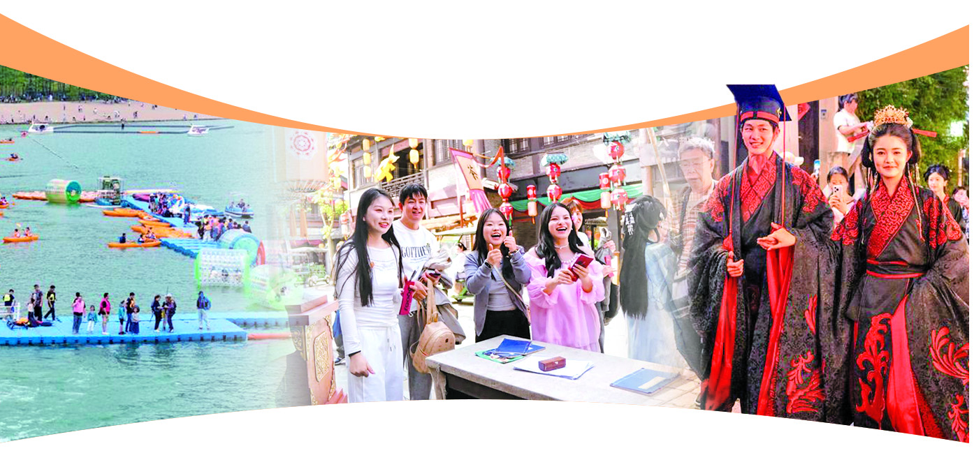 婺城区旅游人气同样爆棚,“五一”首日境内A级景区接待游客量较去年同比增长超四成。作为金华市区旅游的“人气王”,金华山双龙风景旅游区线上门票连续多日售罄。双龙洞洞口的小学语文课本艺术装置成了网红打卡点,吸引游客排起长队。作为“一山一城”品牌组合的婺州古城景区则以丰富的文旅活动吸引游客。“五一”期间,婺州古城以38.5万人次的游客接待量创历史新高,较去年同期增长近50%。