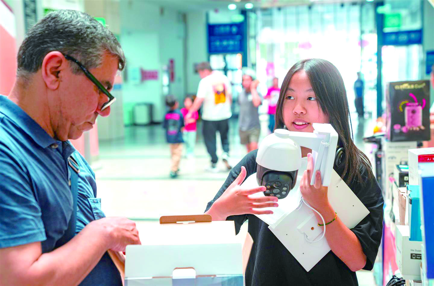 记者 陈业 摄影报道 “This is a solar-powered security camera with 4K resolution!(这是一款结合了光伏的摄像头,支持4K高清画质!)”5月5日,在义乌国际商贸城二区新能源产品专区,小女孩小雨(化名)用流利的英语向国际客商介绍自家最新款的光伏监控设备,专业的产品讲解让在场外商纷纷竖起大拇指。 每逢假期,都会有像小雨这样的“商二代”在义乌国际商贸城上演现实版“小鬼当家”。