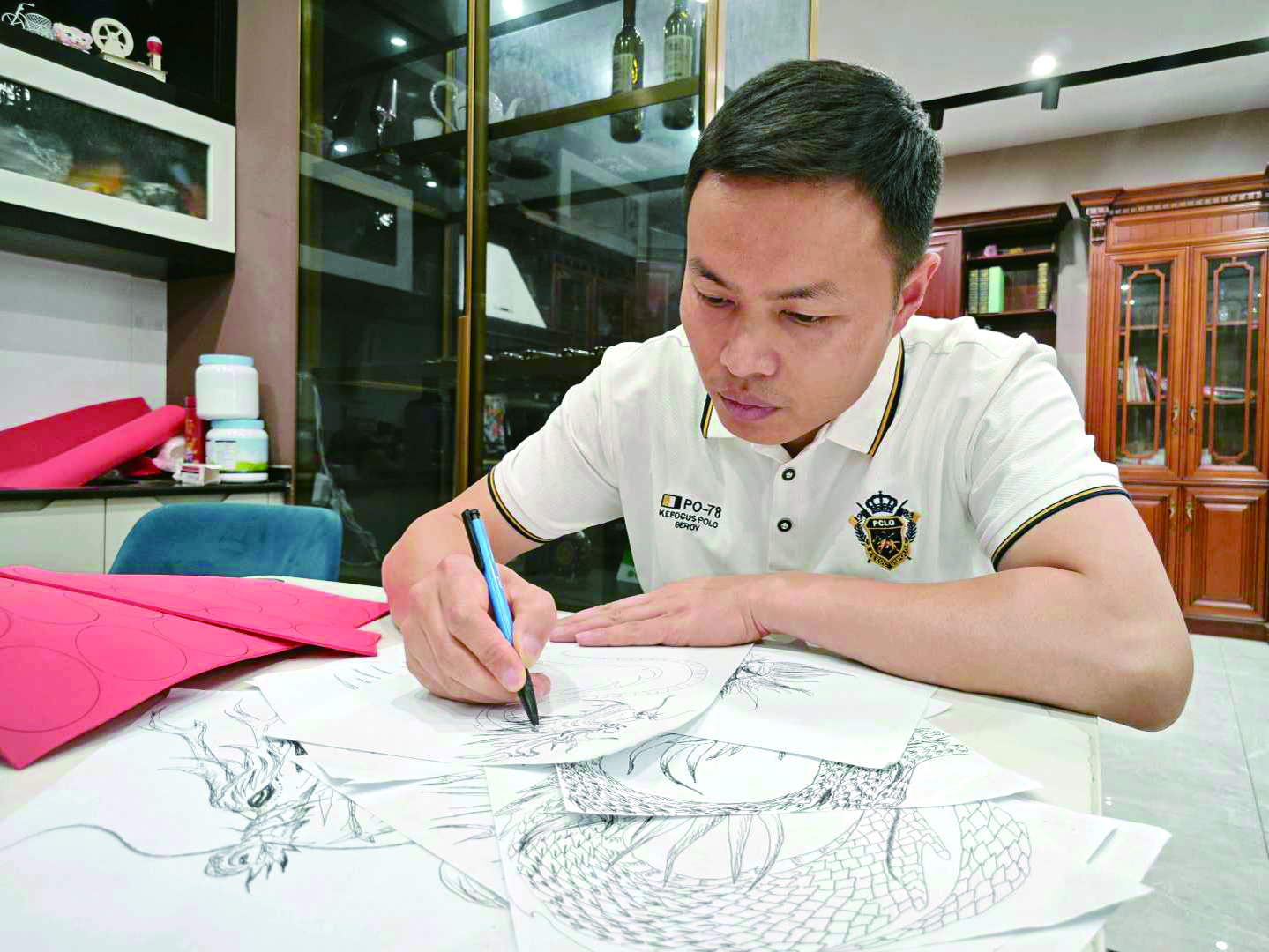 吴承俭是一名家居设计师。很多人听到他的职业和爱好后,很难把两者联系在一起。工作之余,他喜欢画画,画画的材质不限于纸张,可以是瓷盘,也可以是瓷砖,最喜欢画的是中国神话传说中的龙,已经画了10多年。