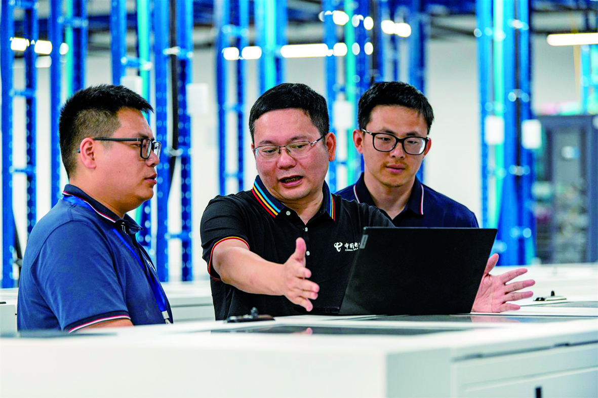 记者 胡肖飞 文/摄 5月13日,在浙中人工智能算力中心,全国劳动模范、中国电信金华分公司首席技术官王志刚(中)和青年员工互相交流,传授技能。该公司以“创学研”的形式,培养实用人才。