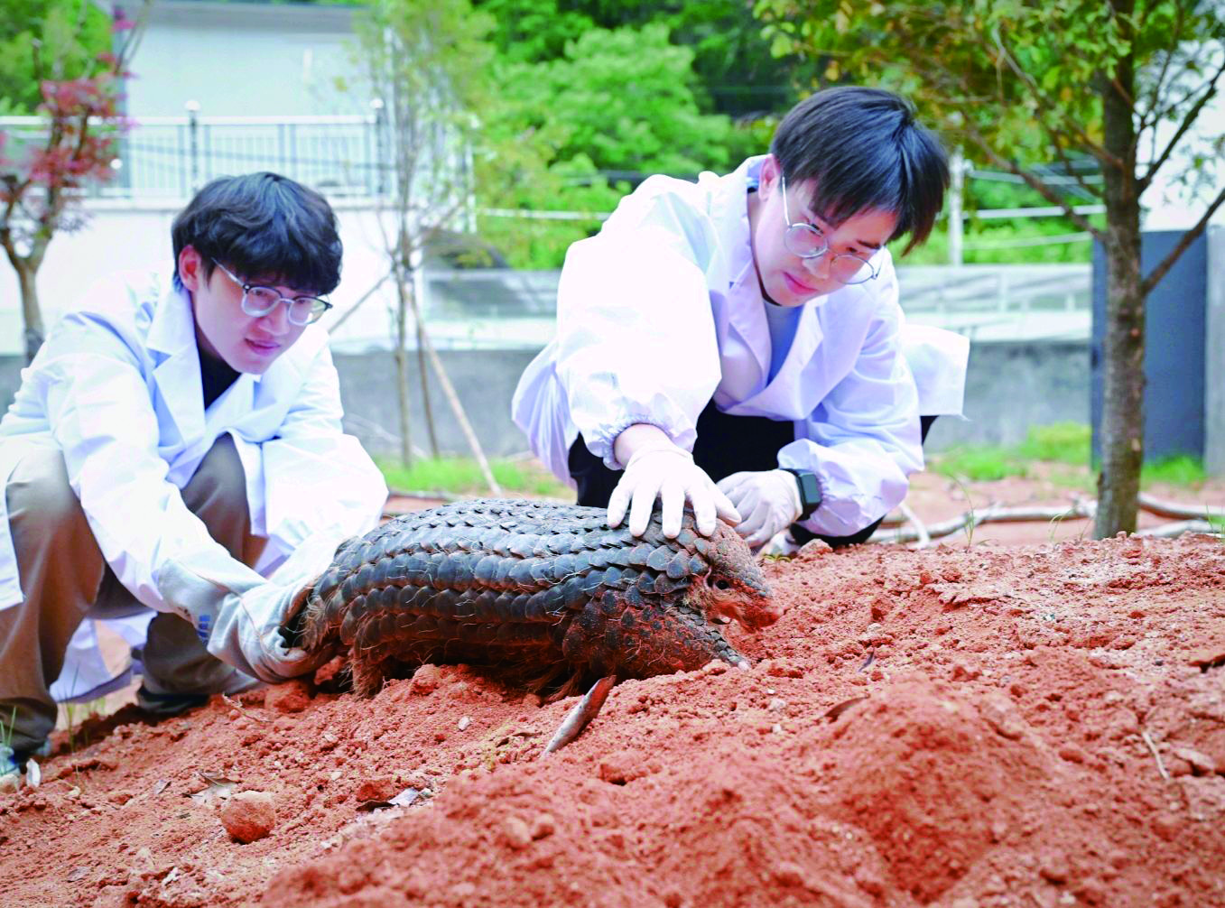 昨日,在婺城南山省级自然保护区濒危动物保护基地内,科研人员正在对前期收容救护的中华穿山甲进行野化训练。