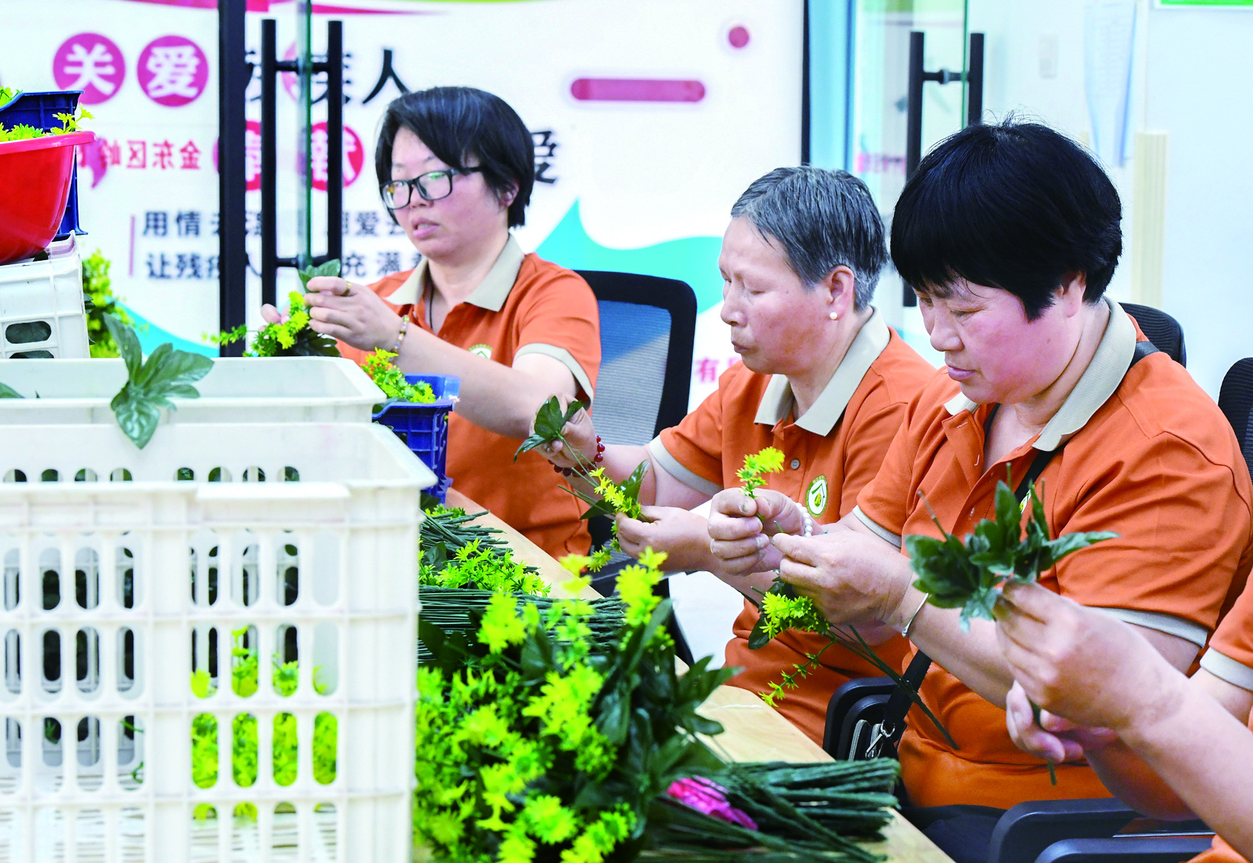 记者 时宽兵 文/摄 昨日,在金东区岭下镇“残疾人之家”内,各村残疾人聚集在一起做手工活,组装塑料花。 据悉,岭下镇残联工作人员通过联系义乌小商品生产企业,对接了组装塑料花、香水瓶等一些简单易学的来料加工手工活,帮助残疾人增加收入,自食其力。