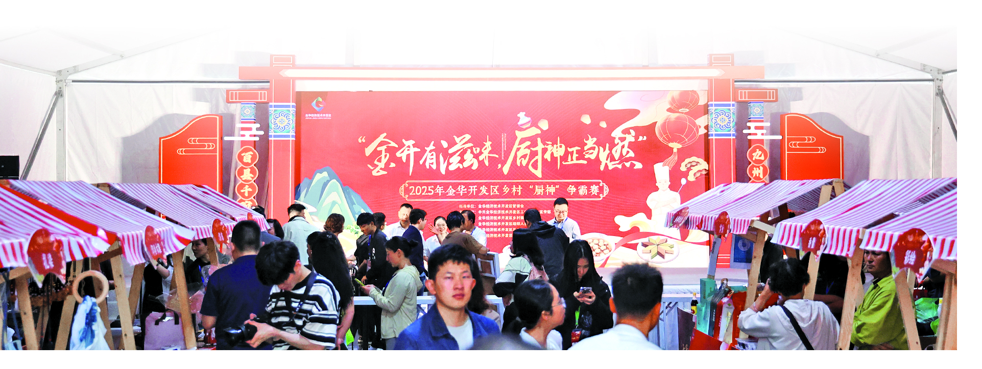 活动现场还设置了市集,既有干莲子、腌菜、金华大米等农特产品,还有印婺木雕、漆扇、盘扣、扎染、手工编绳等非遗技艺和手工文创产品。赛程间隙,还有精彩的非遗舞狮和舞蹈表演。此次比赛不仅是一场厨艺竞技的盛会,更是一次非遗文化的生动展示,激发了群众对本土美食文化的认同感和自豪感,为乡村振兴注入了新动力。