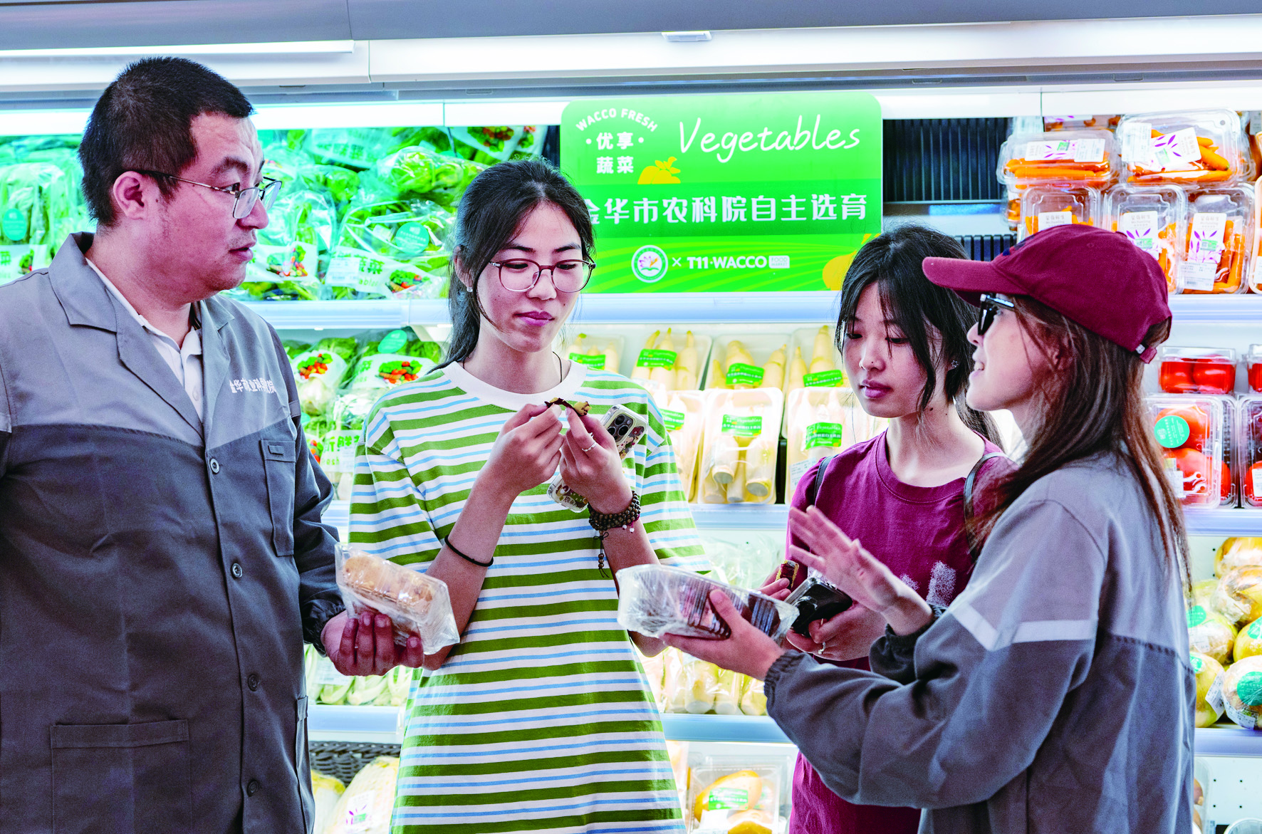 记者 陈业 文/摄 5月16日,在市区一家超市内的货柜前,工作人员正向顾客推荐由市农科院和中国农科院甘薯研究所共同研发培育的榴莲蜜薯(金农蜜薯)新品种。 这是本地农科院首次与超市合作,将研发选育的茭白(浙茭10号)、土豆(华颂香早)等品种在超市货架上进行陈列销售,以其高营养价值和较好的口感,吸引不少市民购买。这一举动让科研产品从实验室走向大众餐桌,推动我市农产品的市场拓展,丰富了消费者的选择。