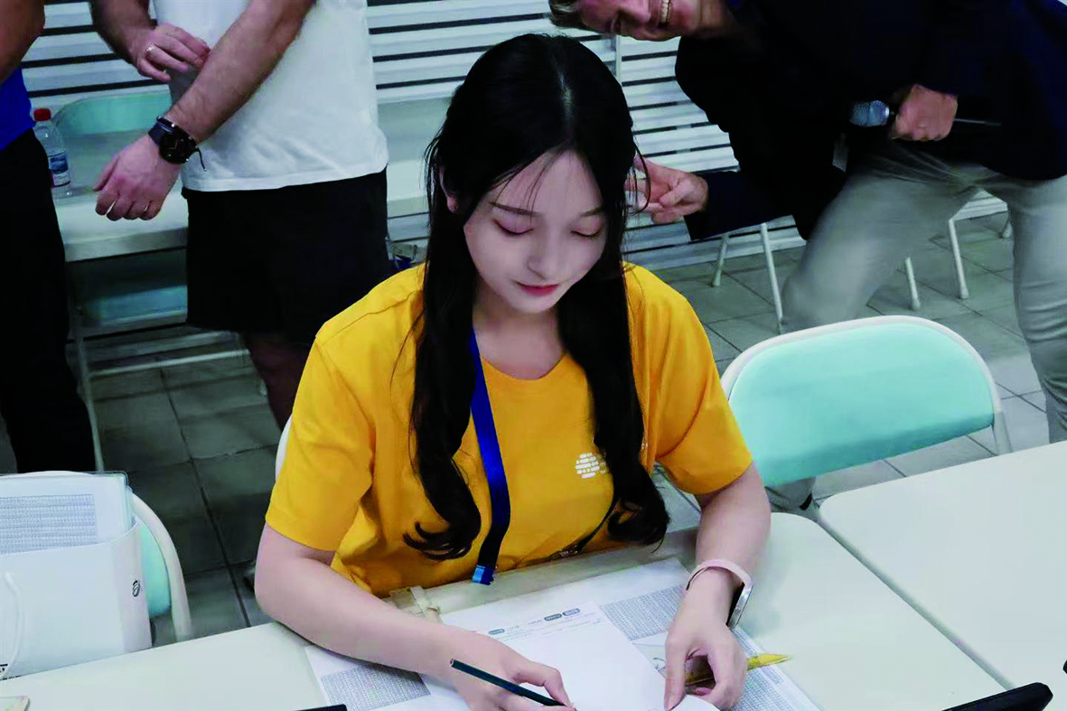 吴欣今年23岁,目前在北京交通大学法学院就读研究生。作为法学院的学生,她不仅系统学习了法律理论与实务,还通过课程中严谨的逻辑训练和案例分析,培养了快速判断与精准执行的能力,这对她在赛事中高效完成分数核算工作大有裨益。她担任了此次跳水世界杯总决赛(北京)的竞赛部门志愿者,需要在每位裁判打分后,迅速计算出运动员的实际得分,并与打分系统计算的结果进行核对。
