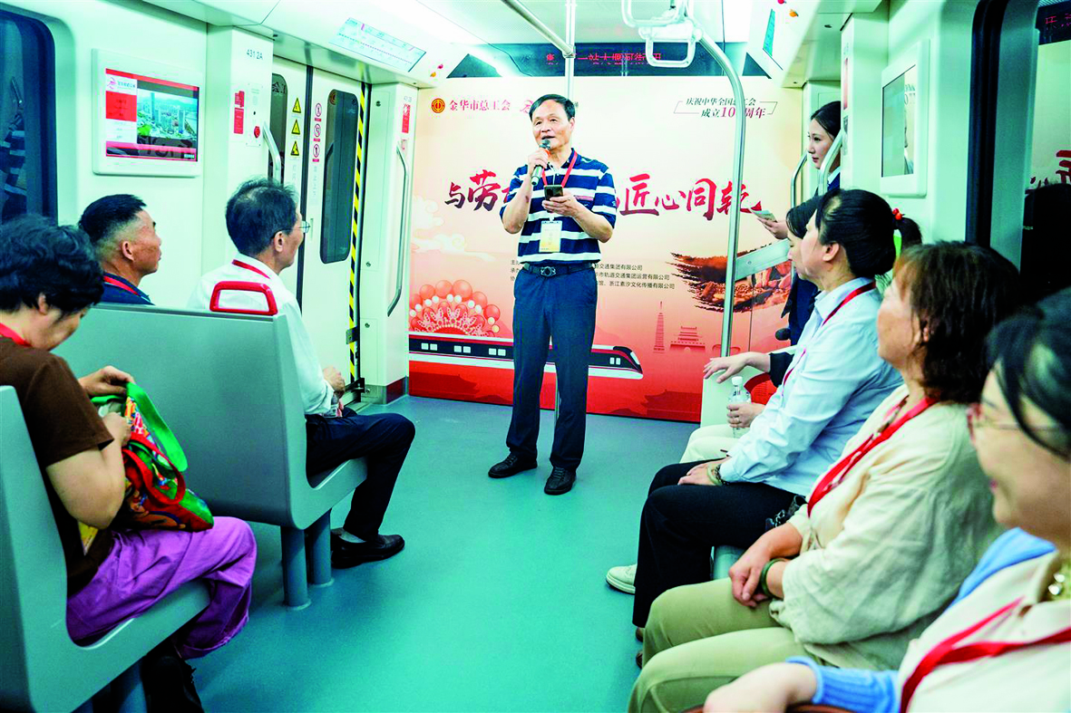 记者 傅俊 摄影报道 5月17日,市总工会联合市轨道交通集团有限公司,开展“与劳模同行 与匠心同轨”主题活动,32名劳模登上“金轨先锋号”列车,由高亚军、张茂秀、戴燕飞、金泽4名劳模代表通过宣讲、互动等形式,与乘客分享奋斗故事与工匠精神。
