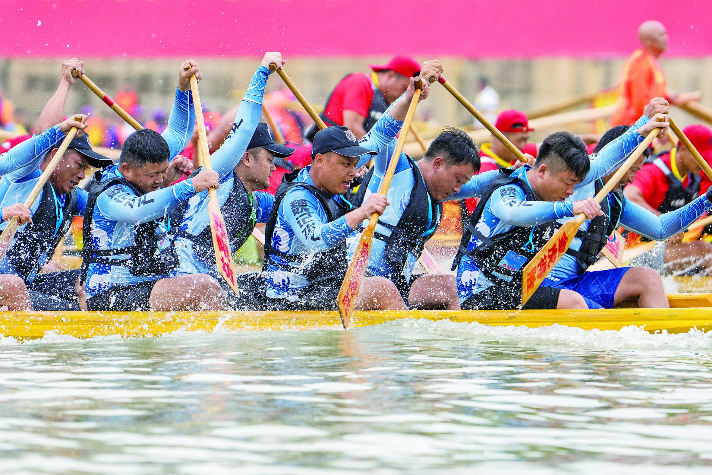 5月25日,参赛队伍在比赛中。 当日,“国家非遗道州龙船传统赛”在湖南永州道县潇水河水域开赛,吸引了当地近200支龙舟队5000余人同台竞技,奋楫竞渡,迎接端午节的到来。 新华社发