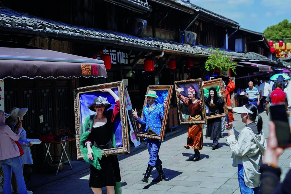 【古堰画乡的山水、古街间,派生出中国乡村意象与西方油画技法交汇融合的“丽水巴比松”画派;当地油画产业化年产值1.2亿元,作品远销法国、美国等60多个国家和地区。】