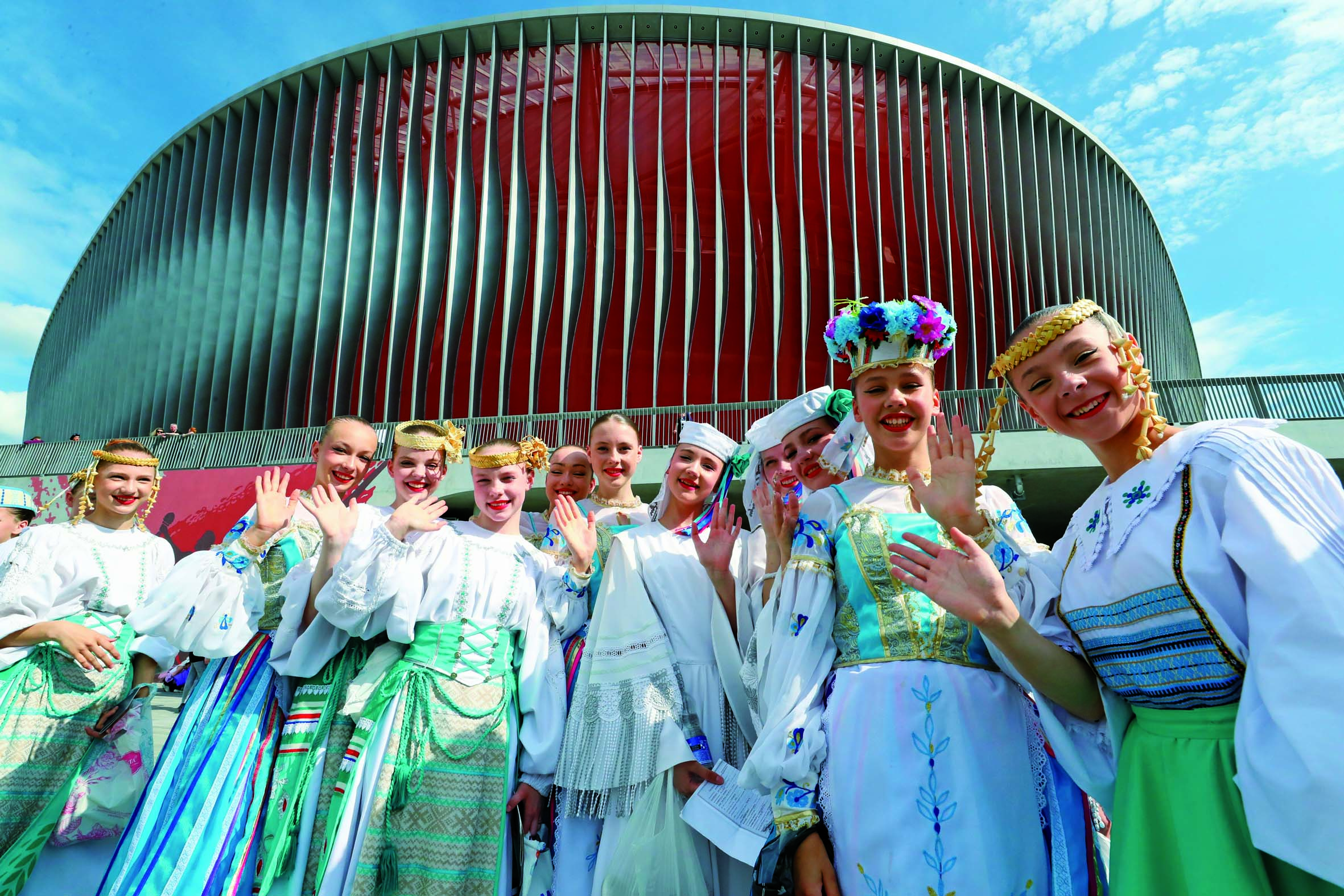 6月7日,在白俄罗斯首都明斯克,身着传统服饰的女孩们在中国援白俄罗斯国家足球体育场前合影。 中国援白俄罗斯国家足球体育场7日正式启用,中国和白俄罗斯国家青年足球队友谊赛当天在这里举行。白俄罗斯总统卢卡申科出席启用仪式并观赛。