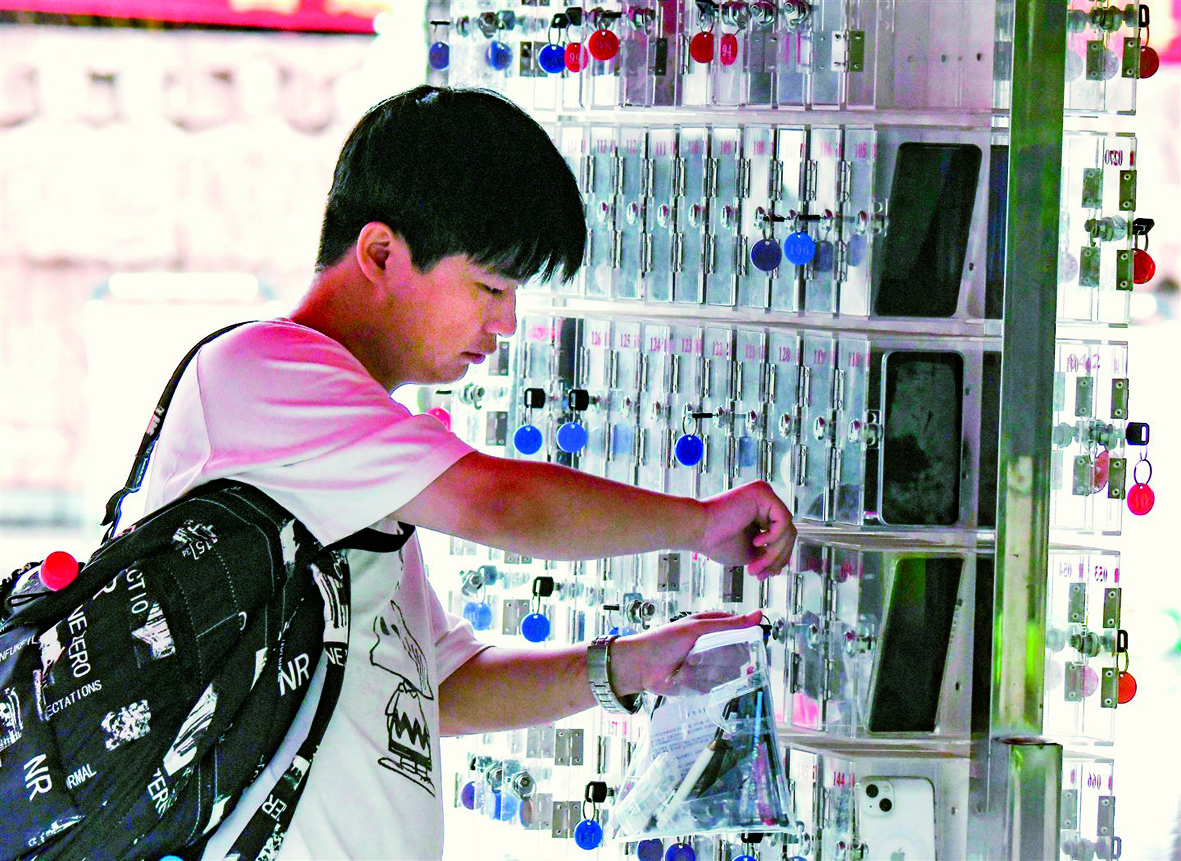 记者 李建林 文/摄 6月8日,在市区一高考考点,考生将手机放入手机自助柜,再进入考场。 据了解,高考期间,考生不得携带任何书刊、具有通讯功能的工具(如手机、蓝牙耳机、智能手表、智能手环、智能眼镜等设备)等物品进入考场。设置手机自助柜,方便了考生存取通讯设备。