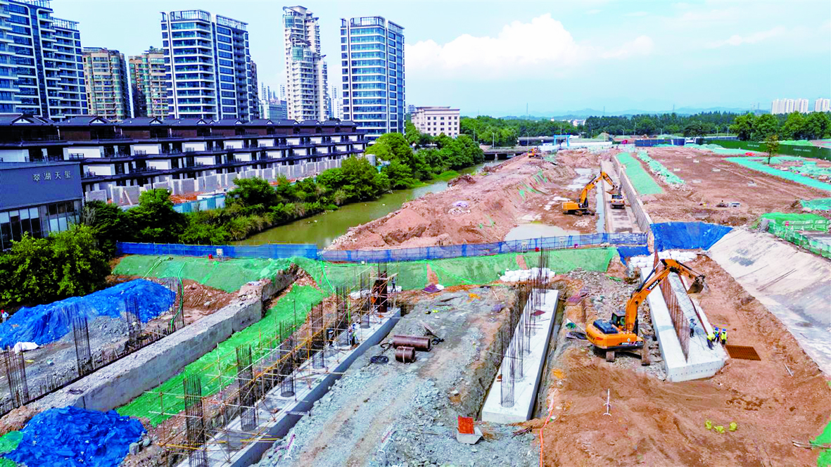 记者 胡肖飞 文/摄 近日,俯瞰永康市城市防洪华溪整治工程施工现场,施工人员和机械正在忙碌建设中。该工程总投资3.78亿元,建设内容包括新建华溪节制闸、拓宽田宅分洪渠、改建金城路桥和龙川东路桥等,建成后将有效缓解永康城区防洪排涝薄弱问题。