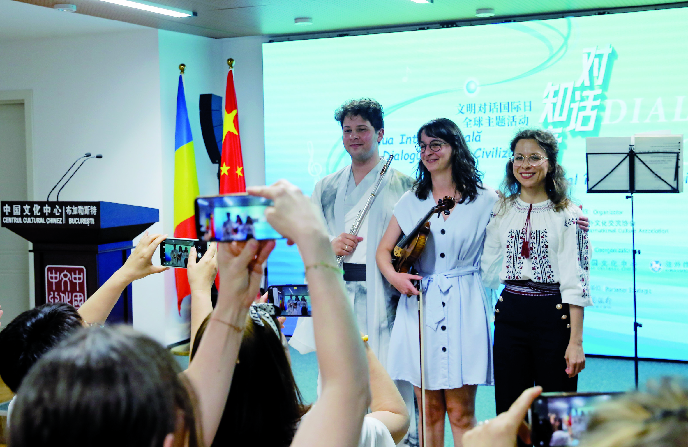 为庆祝首个联合国“文明对话国际日”,“对话·知音”音乐会10日晚在罗马尼亚首都布加勒斯特的布加勒斯特中国文化中心举行,中罗各界近百名嘉宾出席。图为罗马尼亚音乐人在“对话·知音”音乐会上谢幕合影。 新华社发
