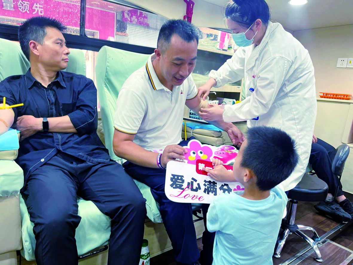 记者 董金姣 文/摄 “爸爸,这两个字是念‘爱心’吗?”昨天下午,在市区永盛购物广场门口爱心献血车里,6岁的小豆丁在陪爸爸献血时,拿着一块写有“爱心满分100%”无偿献血宣传板认字。这是市民康先生第11次参加无偿献血,献血时长已有12年。 每年6月14日是世界献血者日。不少市民走上献血车,他们有的是第一次参加献血,有的是定期献血者。市中心血站的工作人员说,感谢这些充满爱心的“热血侠”,也希望更多市民参与到无偿献血和造血干细胞捐献中来。