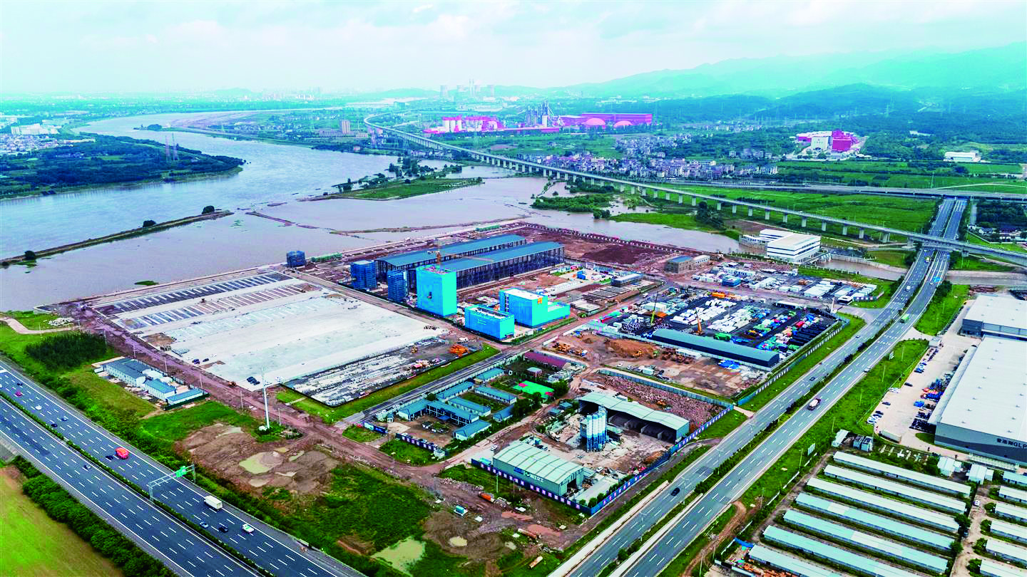 6月16日,俯瞰位于婺城区乾西乡的金华港婺城港区乾西作业区项目建设现场,整体雏形已现(无人机照片)。
