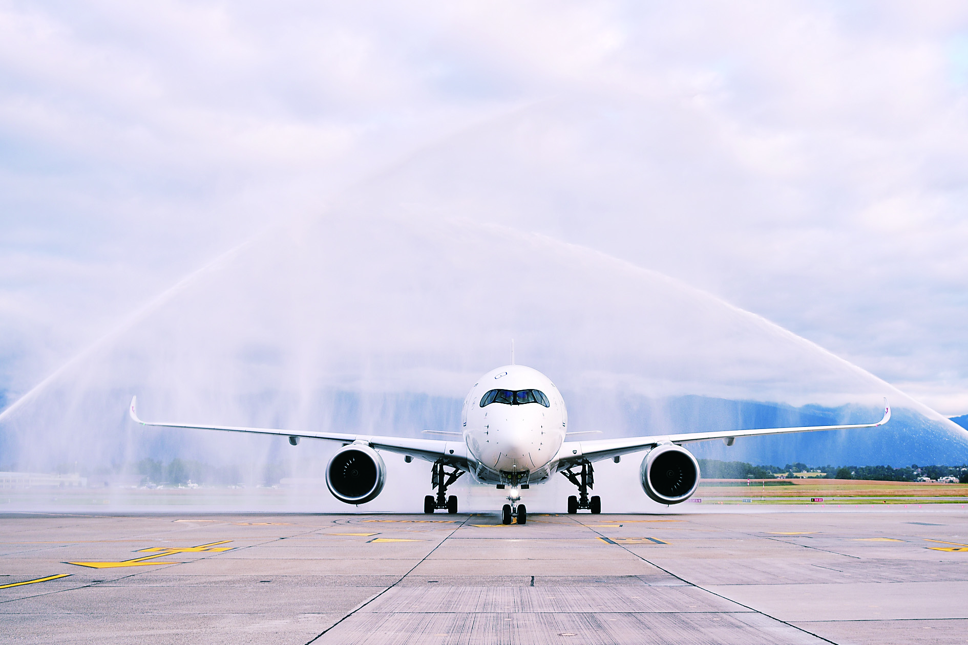 6月16日,在瑞士日内瓦,从上海浦东国际机场起飞的MU217航班穿过象征民航最高礼仪的“水门”。 中国东方航空公司上海至日内瓦直飞航线16日正式开通。当地时间早上7时25分,从上海浦东国际机场起飞的MU217航班平稳降落在瑞士日内瓦国际机场,缓缓穿过象征民航最高礼仪的“水门”,圆满完成从“东方明珠”上海到“和平之都”日内瓦的首航。 新华社发