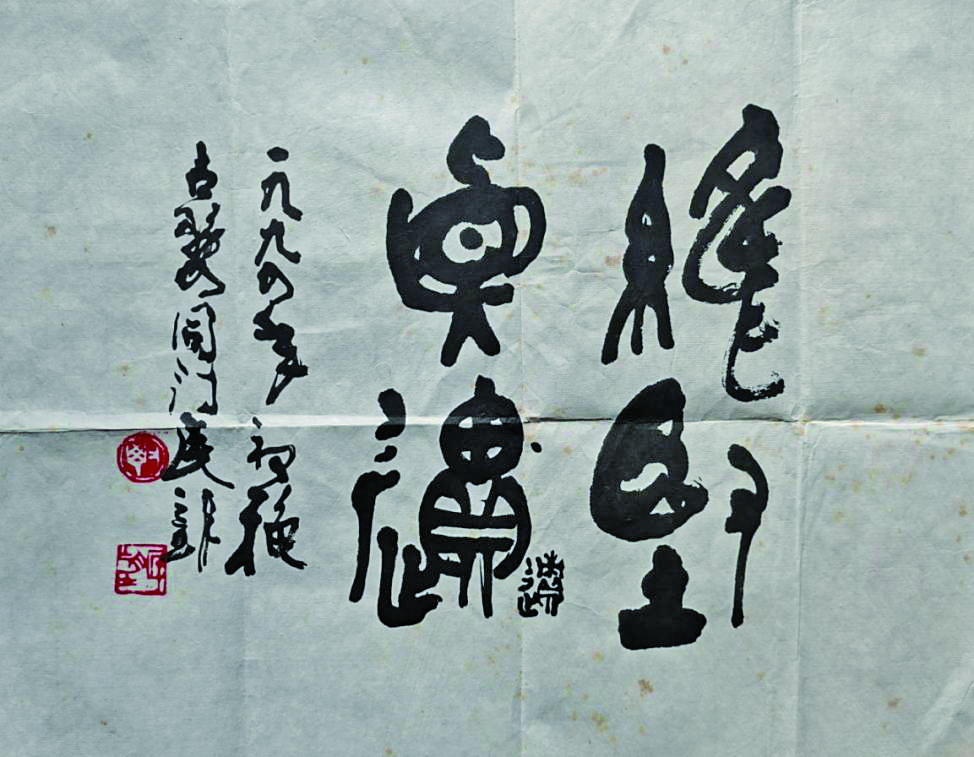 该作完成后的第二年,金维坚就驾鹤仙去了。多年后,该印稿流传到金华籍著名学者叶政中手上。叶政中对此爱不释手,为增加该藏品的艺术分量,1994年初秋的一个早上,他来到金华古子城毕民望的寓所,请他观览。毕民望看到这位亦师亦友、同门、同乡的老友遗作,感慨万千,以独特的篆籀蛮体书法题写“维坚真遗”四字,落款“一九九四年初秋,古婺同门民望”,钤印白文“毕”、朱文“民望”两印。叶政中得毕民望佳题后,将其与金维坚的遗作一并装在一个信封中,题记“金维坚遗墨、毕民望题证,叶政中藏传”,并钤盖上毕民望为其刻制的“叶政中”白文印,至此完成一段艺术佳话。