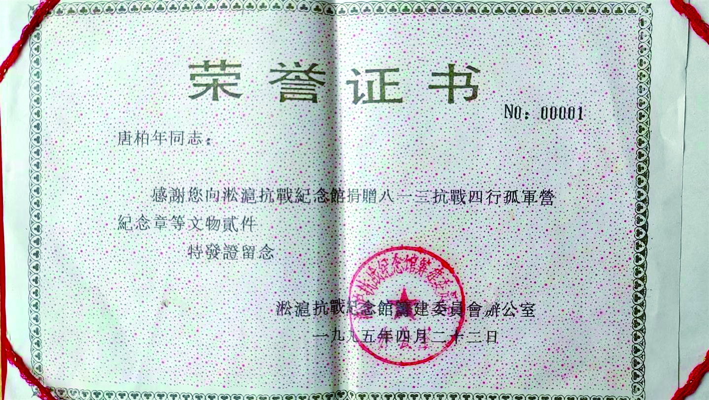 “晚年的父亲,其他事情都记不清了,唯独抗战的事情铭记于心。”在记者采访时,唐志朝几度哽咽。1994年底,当上海淞沪抗战纪念馆寻访到唐家时,唐柏年已在弥留之际,却清楚记得并指引家人从家中木柱子的缝隙里,把自己参加四行仓库保卫战的证明——“四行孤军纪念章”和“谢晋元纪念章”取出来捐献,成为纪念馆首先获赠的文物。