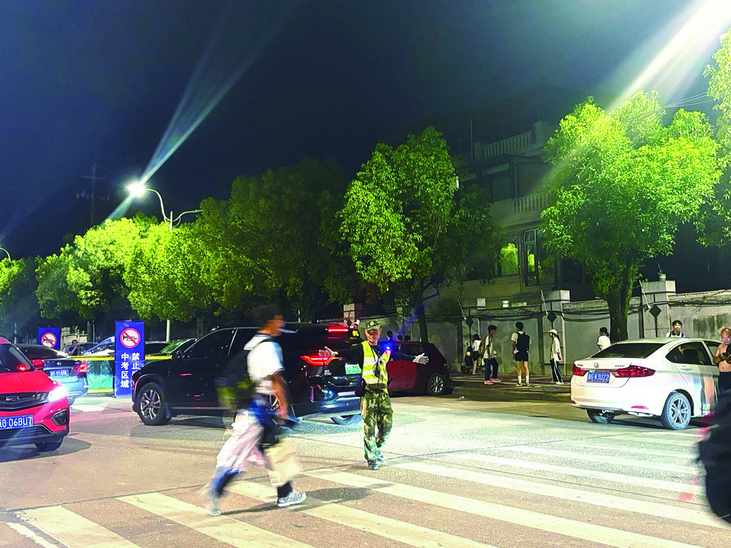 6月21日19时40分,东阳市江北初中中考考点外,路灯渐亮,车流依然繁忙。人群中,身着荧光马甲的陈艳阳正专注地指挥着交通,不时提醒过往车辆减速慢行。此时,他已站了近2个小时。“考试期间有交警负责。所以我是5点半以后来校门口的,主要是联系一些停放在校门口的车辆挪移、疏导交通,以及提醒司机不要鸣笛,让学生们能安心复习,迎接第二天的考试。”