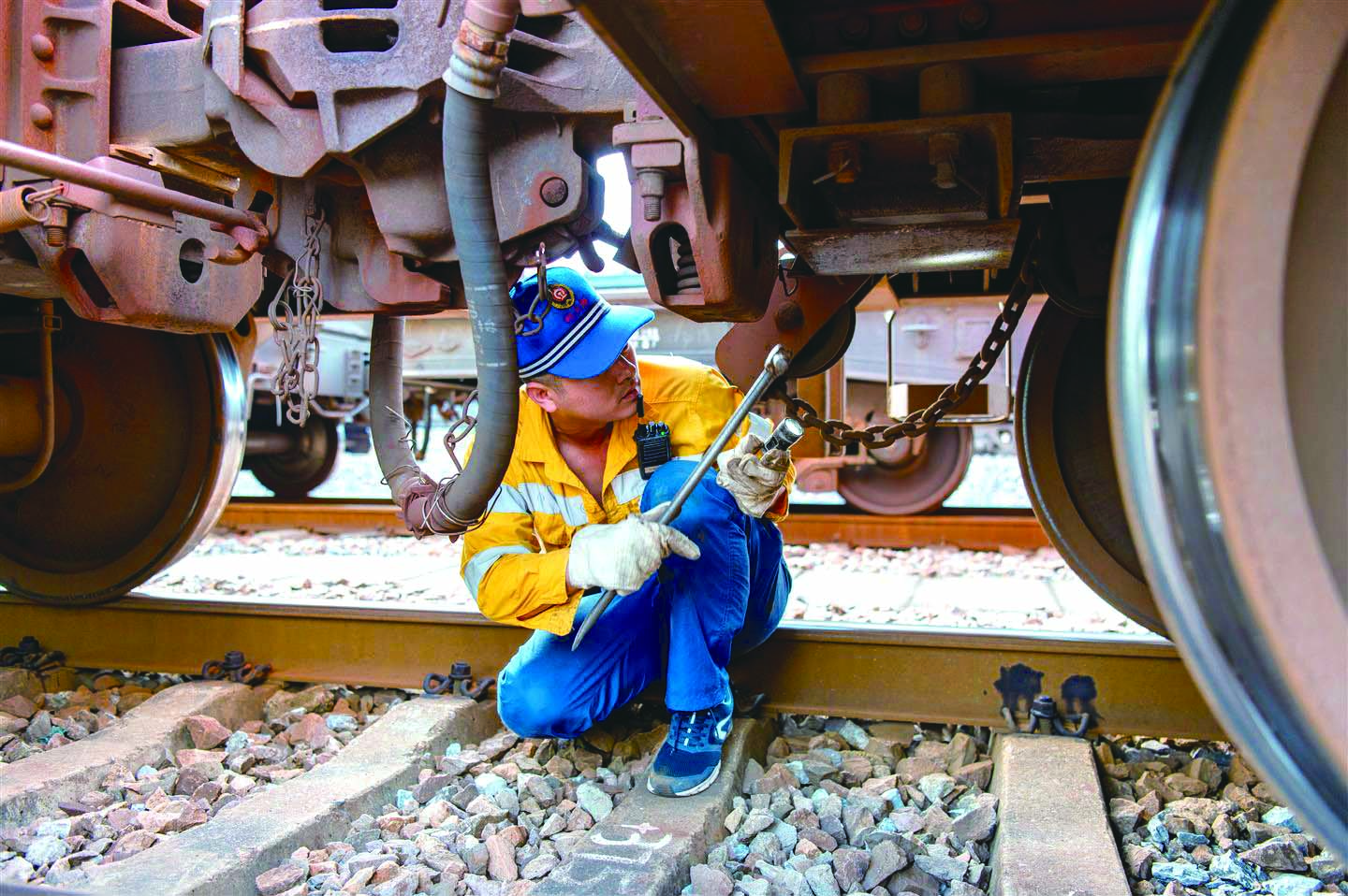 记者 胡肖飞 文/摄 6月16日,金华东站站场里,杭州北车辆段金华运用车间的货车检车员正在认真巡检一列中欧班列关键部位。 该作业场地处长三角地区交通运输中心地带,背靠“世界超市”义乌,肩负着钢材、煤炭、小商品、汽车等物资的中转重任。货车检车员每天为南来北往的货车“望闻问切”,对铁路货车车体及其零部件进行检修。