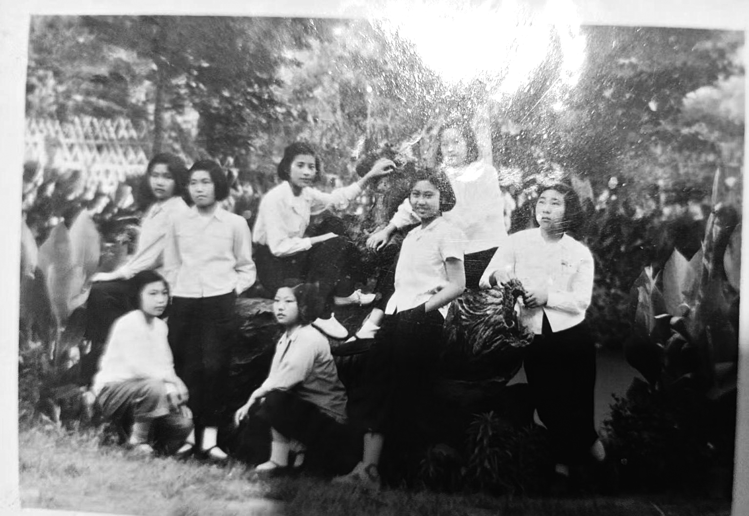 通过微信,金杭娟给孔素珍发了一张同学们在校园里的合影。照片上有8个女生,她们留着齐耳短发,有的蹲在草坪上,有的靠在假山边,脸庞上写满青春的笑意。