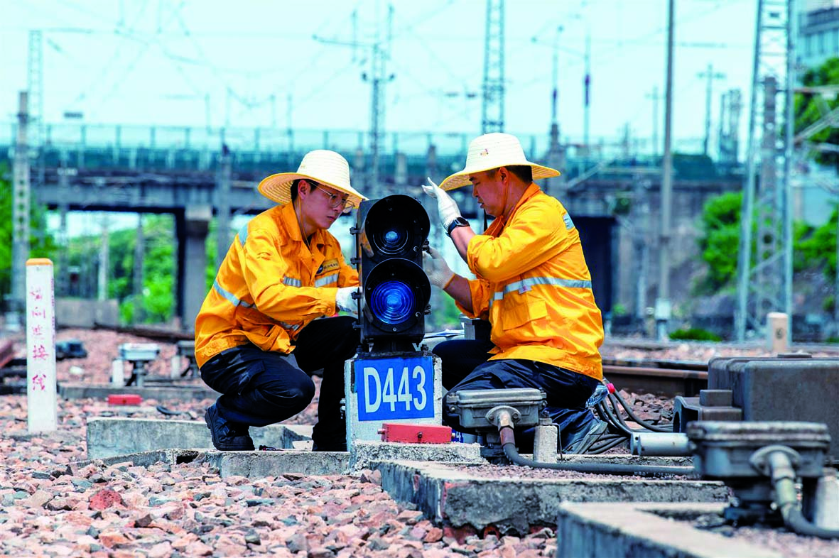 记者 胡肖飞 文/摄 昨日,在铁路金华站线路股道上,铁路杭州电务段工作人员进行轨道设备养护。 为确保7月1日即将开启的暑运运输安全,连日来,在铁路金华站线路股道上,铁路杭州电务段工作人员头顶烈日,进行轨道电路数据测试、信号机养护和道岔养护工作,确保设备以最好状态迎接暑运“大考”。