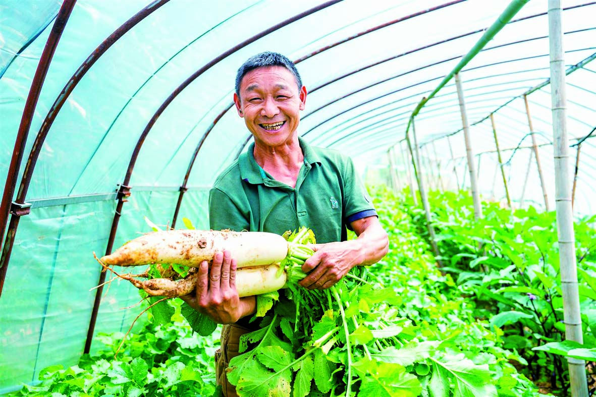 记者 傅俊 文/摄 前天,婺城区罗店镇盘前村的蔬菜大棚里,村民正忙着采收高山萝卜、番茄,为每天两次前来运输的邮政无人机“邮递员”和上山游客备货。 “村里农户所种的萝卜品种为浙萝6号和白玉春,单个重2公斤左右,亩产值1万多元。”盘前村党支部书记章军介绍,目前盘前村共有110余户人家,有105户以蔬菜种植为业,拥有蔬菜大棚2100余个,种植面积约2300亩,年产值约2200万元。如今的盘前蔬菜上午采摘下午就能摆上市民餐桌,做到高山蔬菜半日达。