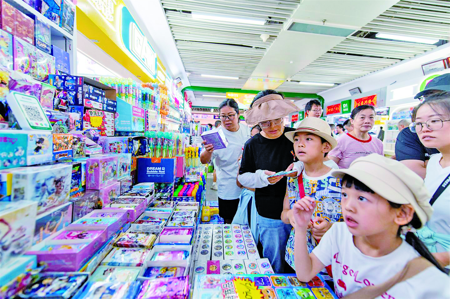 记者 胡肖飞 文/摄 6月29日,义乌国际商贸城,游客带着孩子在购买玩具。 随着暑假到来,被誉为“世界超市”的义乌国际商贸城里“暑期经济”快速升温。连日来,各地游客带着孩子前来市场游玩、采购,文旅消费呈现出一派热闹的繁荣景象,玩具、礼品、体育用品等小商品交易旺盛,“世界超市”掀起一股暑期购物热潮。