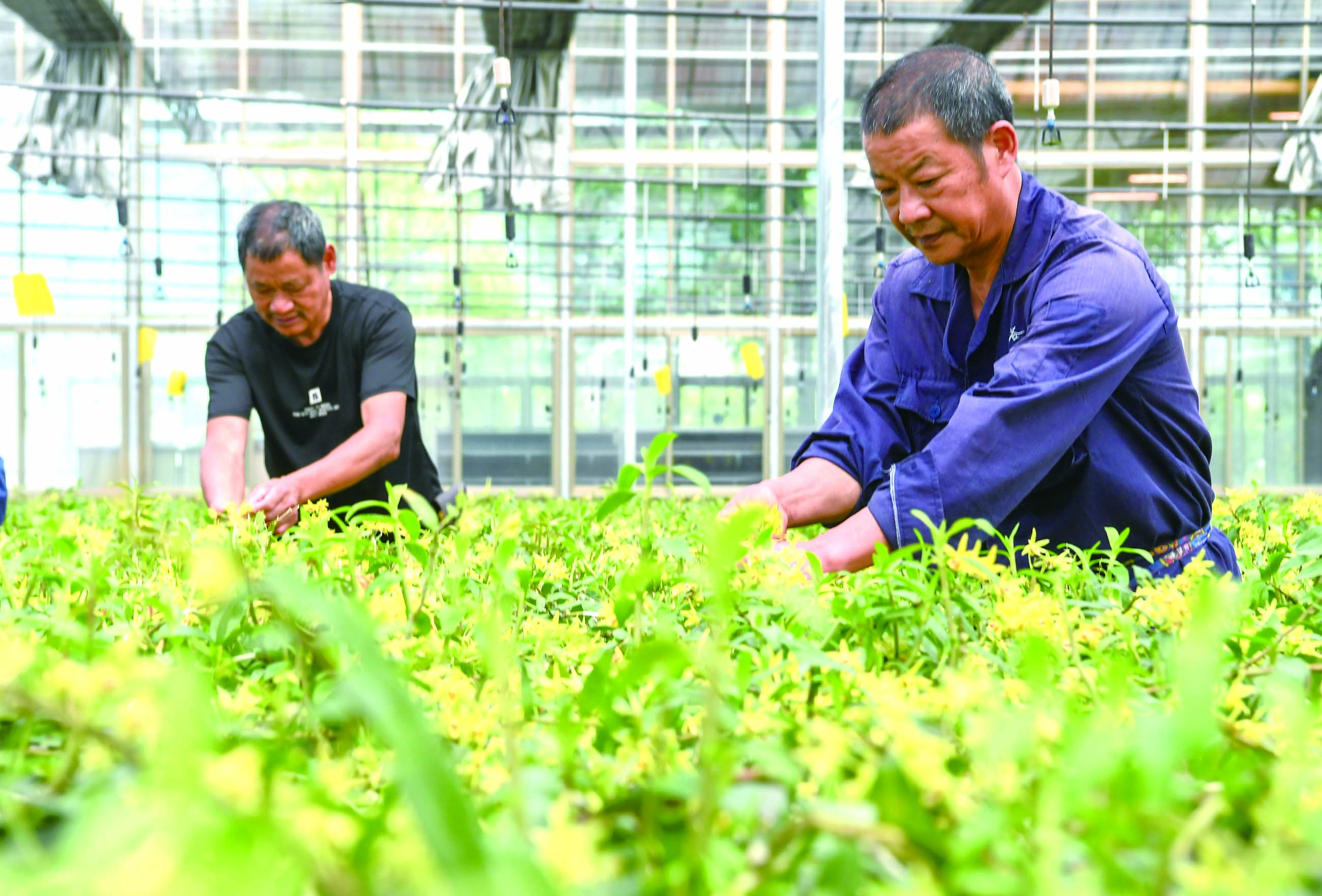 记者 巩长青/文 时宽兵/摄 眼下正值铁皮石斛花期,在武义县白姆乡寿仙谷有机国药共富工坊的智能大棚里,村民们忙着采摘新鲜石斛花。 据了解,这是武义县白姆乡与国家级农业龙头企业寿仙谷协同打造的“共富工坊”模式。当地以“企业+基地+农户”为核心,整合龙头企业资源,村民可以到寿仙谷有机国药共富工坊劳作,同时寿仙谷免费为村民提供仿野生有机栽培等先进技术,并通过“共富学堂”开展技术培训,帮助村民变身“技术药农”。