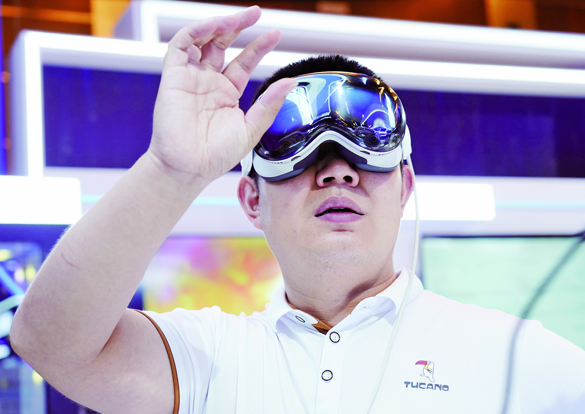 7月2日,参观者在2025全球数字经济大会数字经济国际交流合作体验区体验一款MR混合现实设备。当日,2025全球数字经济大会在北京国家会议中心开幕。本届大会以“建设数字友好城市”为主题,呈现开放共享、聚焦前沿、产业融合、增强体验四大亮点。 新华社发