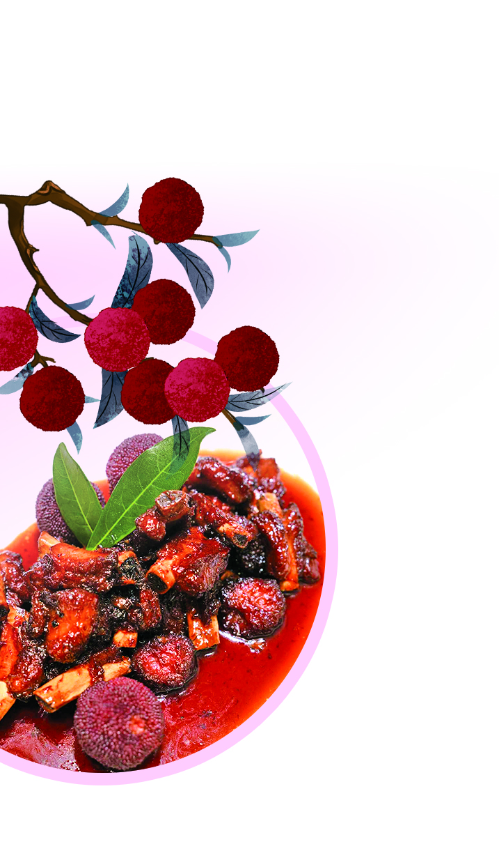 排骨焯水后油炸,冰糖炒出糖色,将排骨放入同炒,再加入杨梅汁与调料小火慢炖,等到肉质软糯时便可出锅,再放上杨梅作为点缀。一道酸甜的杨梅排骨便可上桌,一口咬下,肉质软嫩,味道鲜甜,杨梅的风味便以另一种方式呈现。兰溪杨梅和金华两头乌的融合不仅带来了味觉上的享受,更在舌尖上营造出一种清新的感觉,给予全新的味蕾体验。
