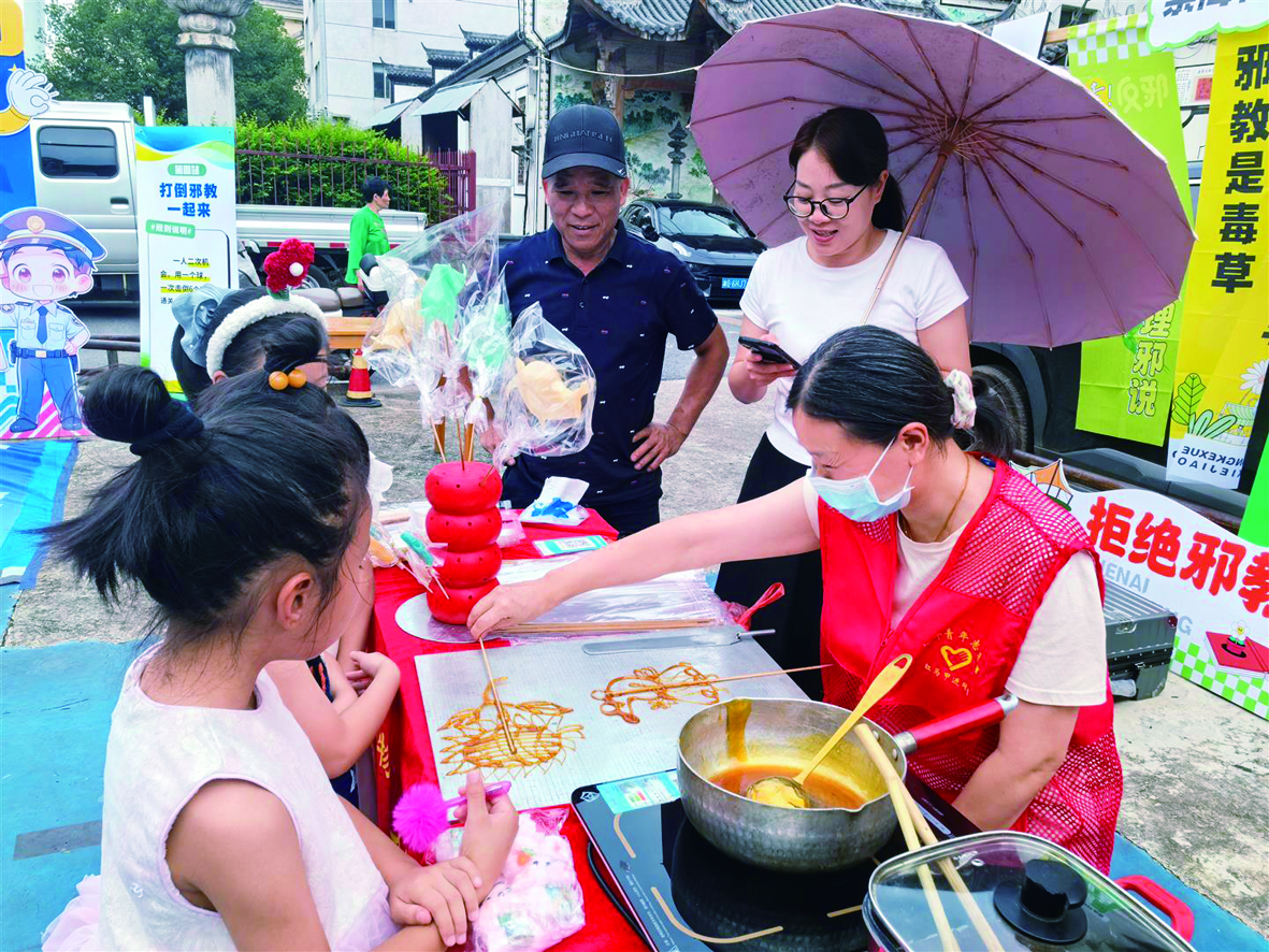 到了晚上,金钱寺社区文化广场同样热闹非凡。社区党组织精心策划共富集市,搭建起一个个特色摊位,商品琳琅满目,有历史悠久、制作技艺被列入金华市非物质文化遗产代表性项目名录的公盛酱油,还有婺城糖画、方高牌冷淘年糕等特色产品,展示本地特色美食和传统工艺。