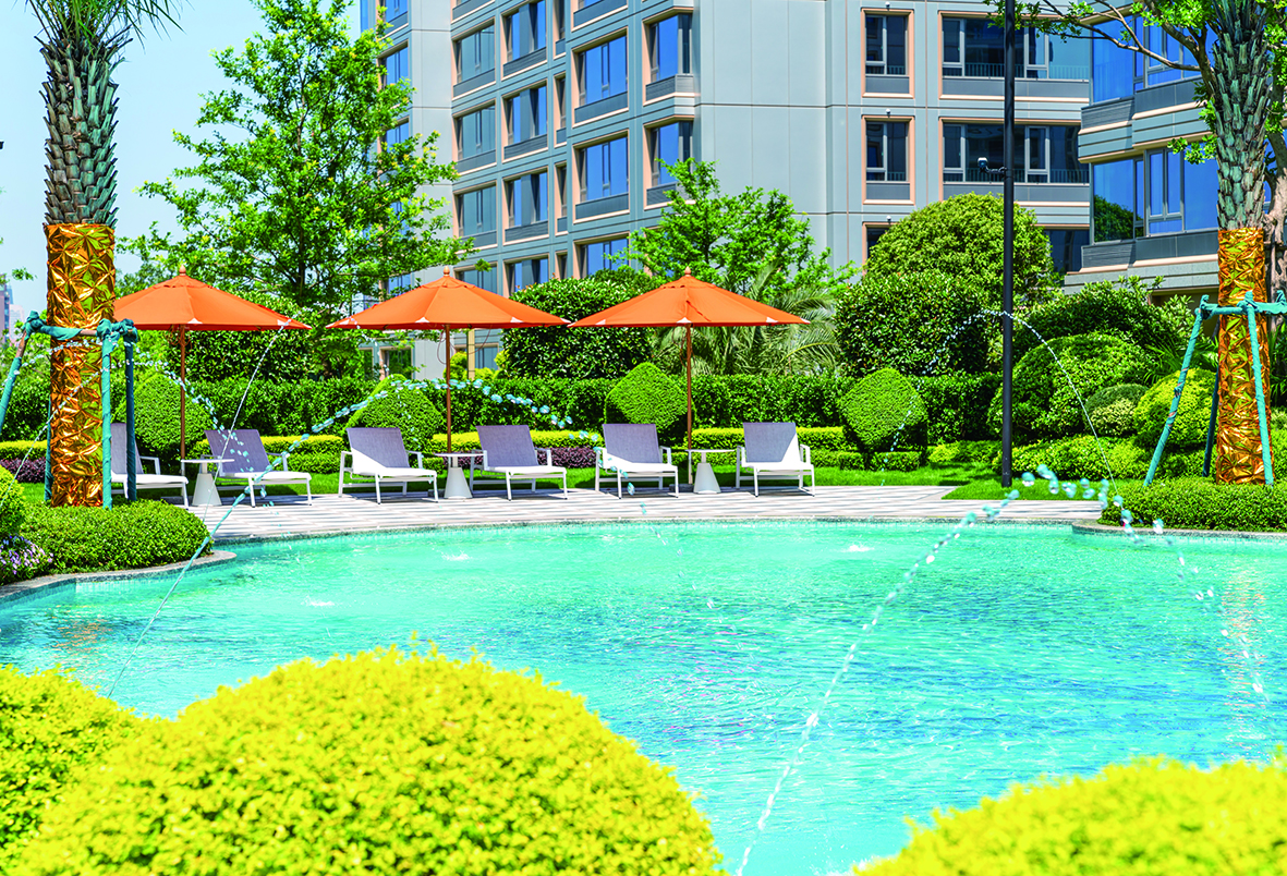 中央泳池与主题乐园则是家园里的度假天地。滨江标志性的蓝宝石中央景观泳池,借鉴地中海度假美学,以流畅曲线塑造无边际视觉效果,辅以池畔吧台、休憩凉亭以及高大的椰树,不出小区即可享受滨海风情。专为儿童打造的“太空之旅”主题室外乐园,通过飞船滑梯、星空地绘等元素激发探索乐趣,实现“下楼即遛娃”的自由。