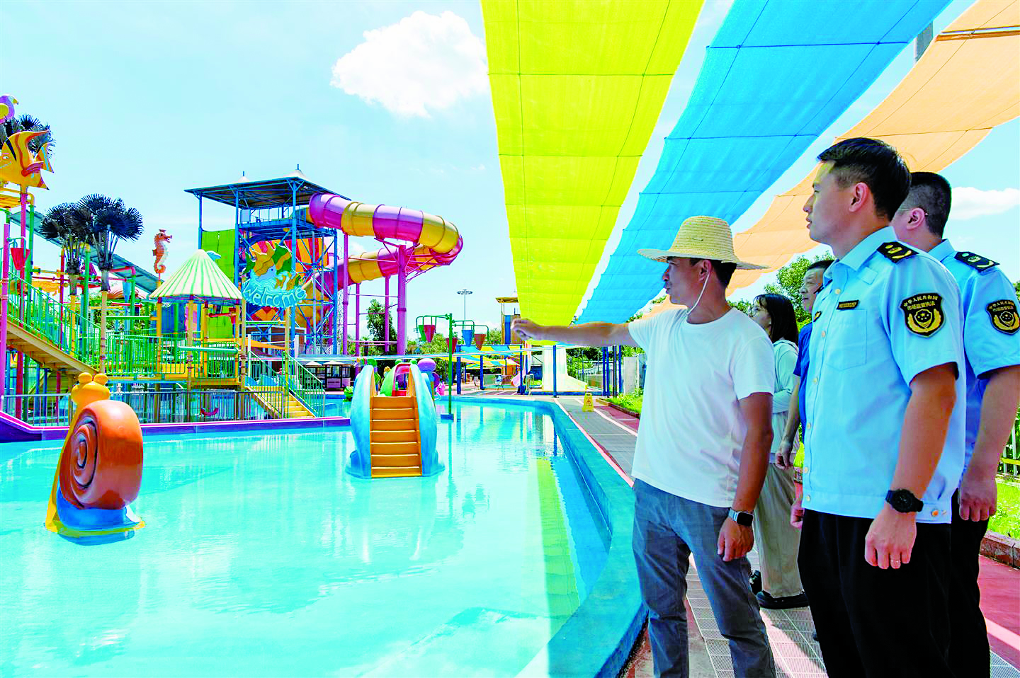 记者 胡肖飞 文/摄 7月4日,兰溪市市场监管局特种设备科工作人员对该市一处水上乐园进行开放前的安全检查。为确保游乐设施的暑期安全运行,连日来,检查人员对该市相关场地、设施开展全面检查服务,筑牢安全防线。