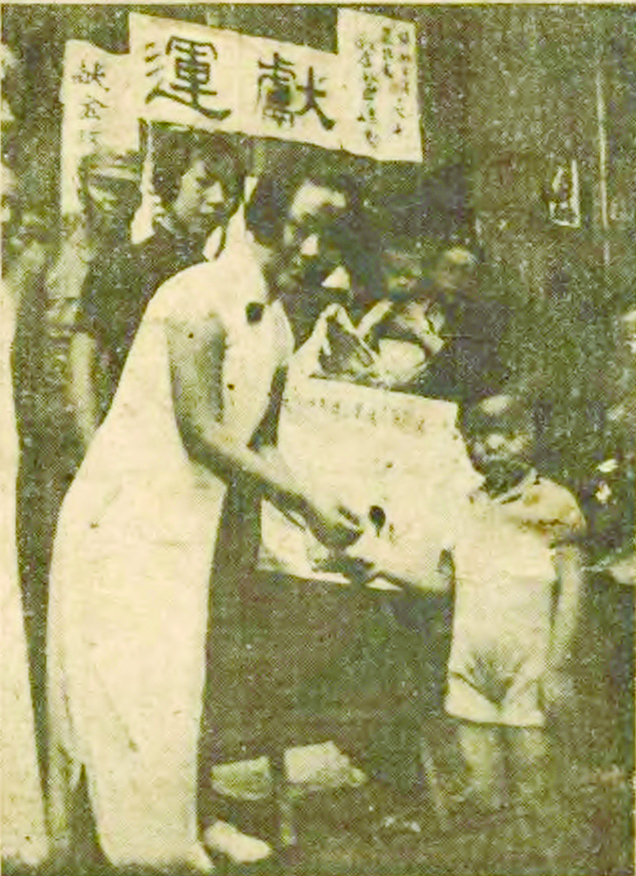 下图则是“献金运动”场景:1939年,“七七事变”两周年之际,7月7日至9日,兰溪县举行自由捐款3天,全程分设捐款柜7处,由妇女会各理事会员分任捐款管理员,热心劝导,并给捐款者献花……