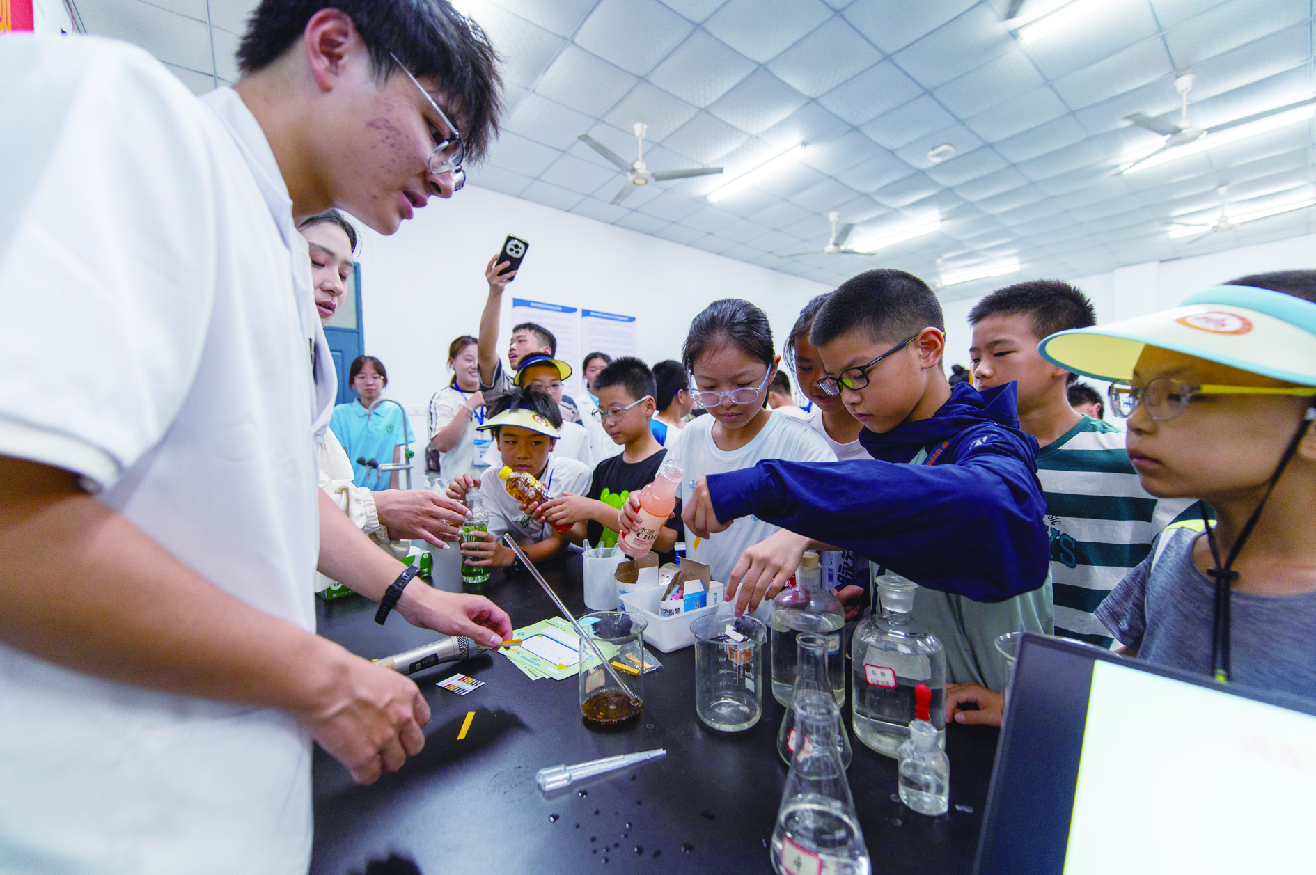 记者 胡肖飞 文/摄 近日,在金华职业技术大学生态文明教育基地里,小学生在开展水质检测科普实践活动。 当天,200多名参加“家门口的少年宫”夏令营活动的小学生走进该生态文明教育基地,在大学生指导下系统学习水资源保护知识,了解水土检测技术的实际应用,并通过科学小实验,亲身破解“水质谜题”,掌握环保实践技能,进一步增强环保意识。