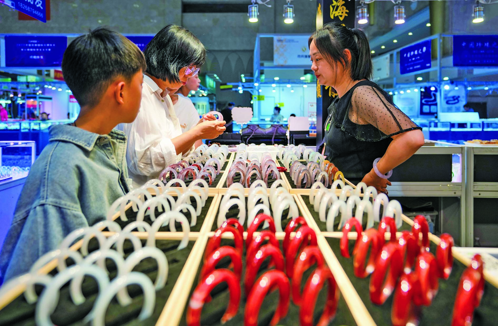 7月10日,消费者(左二)在昆明石博会上挑选玉石。 当日,2025中国昆明国际石博览会(简称“昆明石博会”)暨云南国际珠宝玉石展在昆明滇池国际会展中心开幕。此次展会为期5天,展览面积约5万平方米,汇聚了国内外100余家商协会及展团参展,设有时尚首饰馆、玉石翡翠馆、奇石馆等特色展区。 新华社发