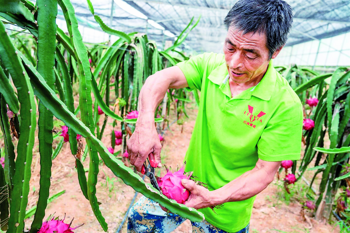 记者 傅俊 文/摄 昨日,记者在婺城区蒋堂镇下汪村汪继青家庭农场的火龙果大棚里看到,红彤彤的果实挂满枝头,果农正忙着采收成熟的火龙果。 据该农场负责人汪继青介绍,目前农场里火龙果共15亩,平均亩产达2000公斤,已有不少采购商上门采购。此外,不少市民、游客前往采摘购买。