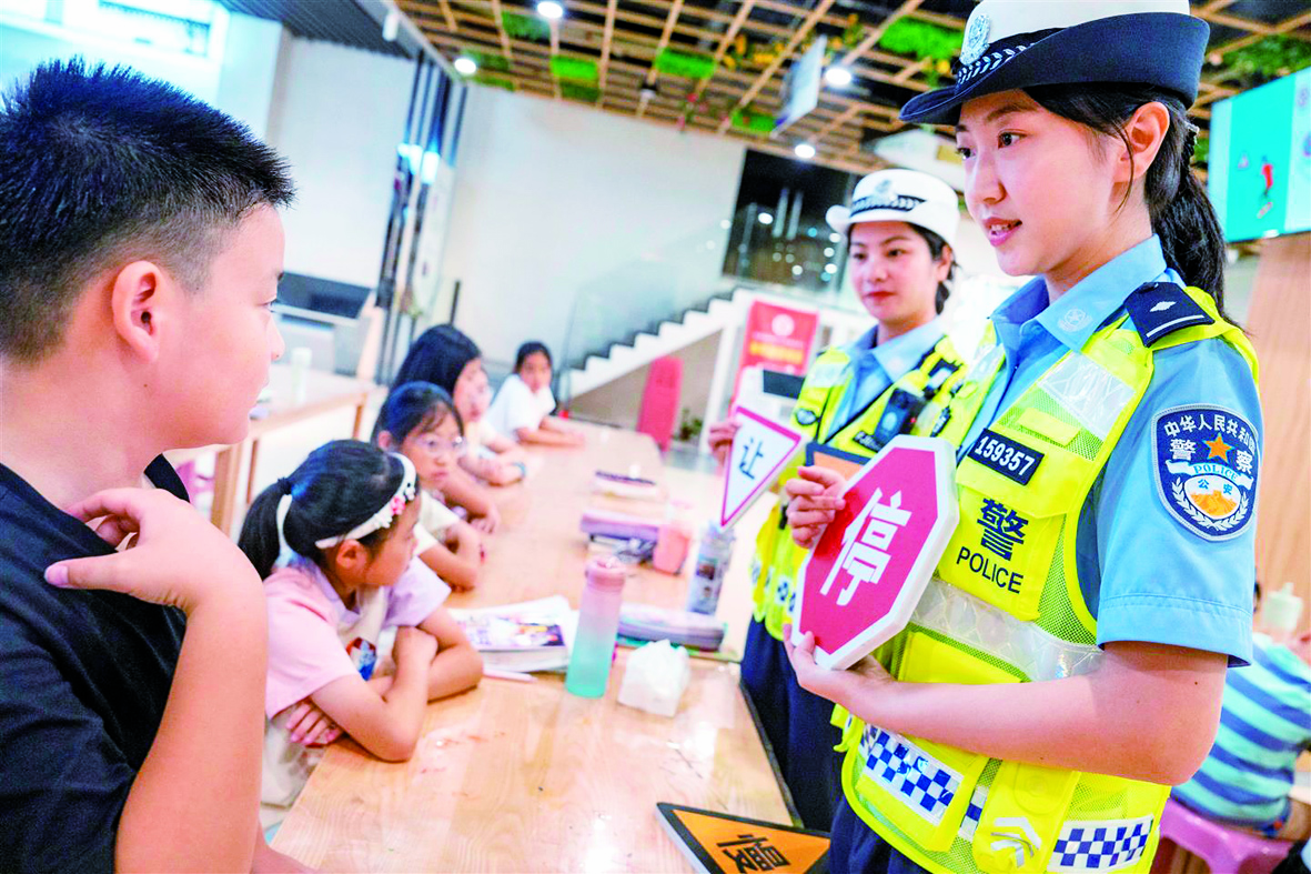 记者 傅俊 文/摄 为切实增强交通安全意识,助力孩子们平安过暑假,7月15日,金华市公安局交通管理支队婺城大队江北中队的民辅警走进婺城区新时代文明实践中心,为爱心暑托班的孩子们带去一堂生动的交通安全课。 民警张嘉琦借助图文并茂的安全宣传课件,讲解交通信号灯、标志标线等基础常识,强调了行人过马路、乘坐机动车及非机动车的注意事项,并科普佩戴头盔容易被忽略的细节,普及“一盔一带”的安全理念,倡导小朋友养成安全文明出行的习惯,切实提高自我保护能力。 课堂上,民辅警们还通过让学生们试穿“小警服”互动体验的方式,现场教学交通指挥手势,让孩子们了解交警日常工作,在轻松氛围中加深对交通法规的理解。