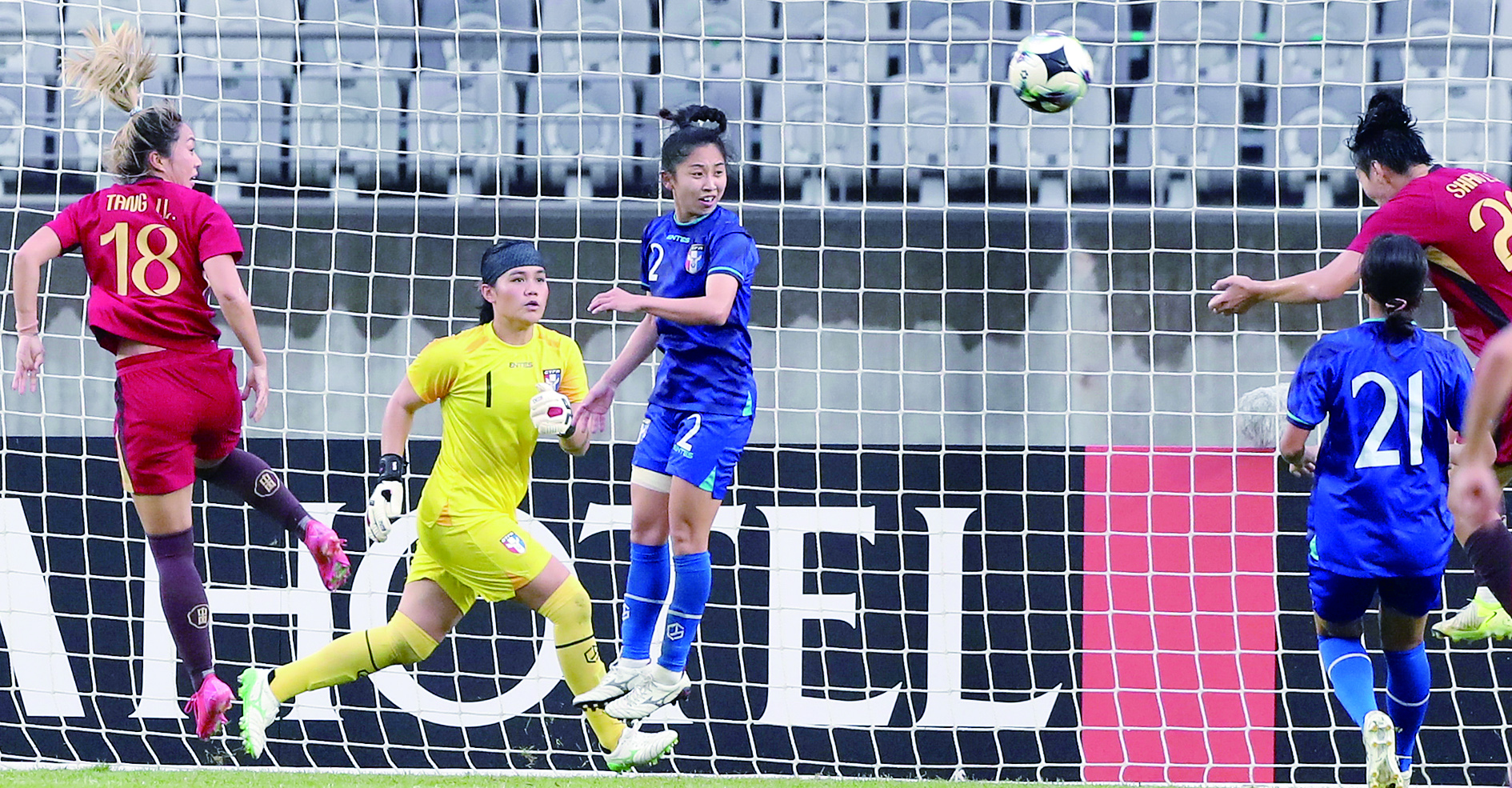 7月13日,中国队球员邵子钦 (右一)头球破门。 当日,在韩国华城举行的2025年东亚足联E-1足球锦标赛(东亚杯)女足比赛中,中国队4比2战胜中国台北队。 新华社发