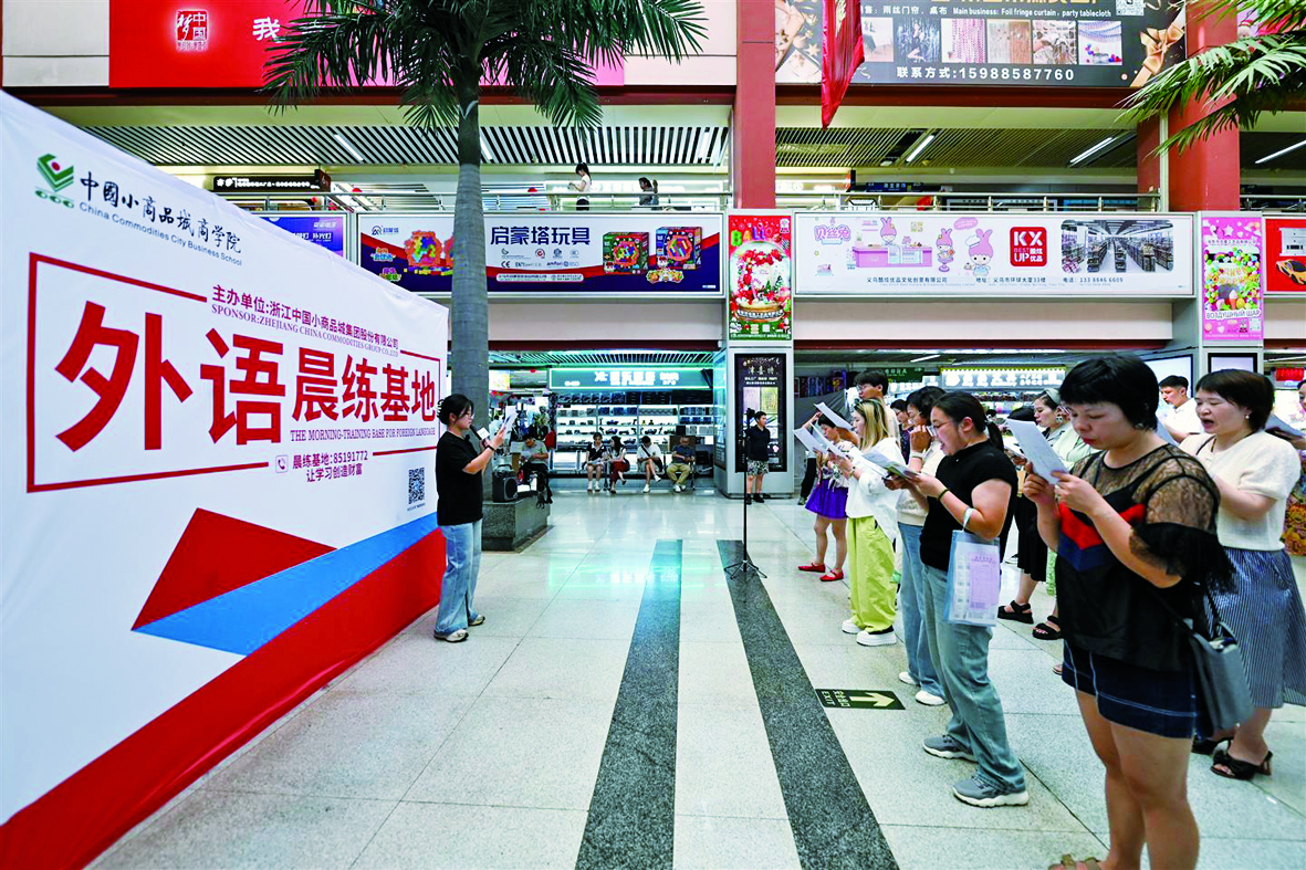 记者 胡肖飞 文/摄 7月15日上午,义乌国际商贸城外语晨练基地,市场商户跟着专业老师学习商务英语。 为帮助商户更好地与外商交流沟通,今年3月开始,义乌国际商贸城外语晨练基地面向全体商户免费开设英语、阿拉伯语、西班牙语等课程教学。