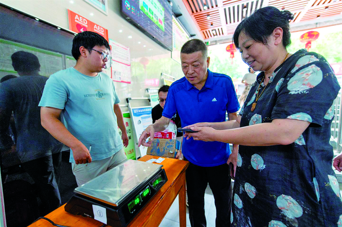昨日,在兰溪市青松市场入口处,顾客体验“手机秒变公平秤”的科技手段。