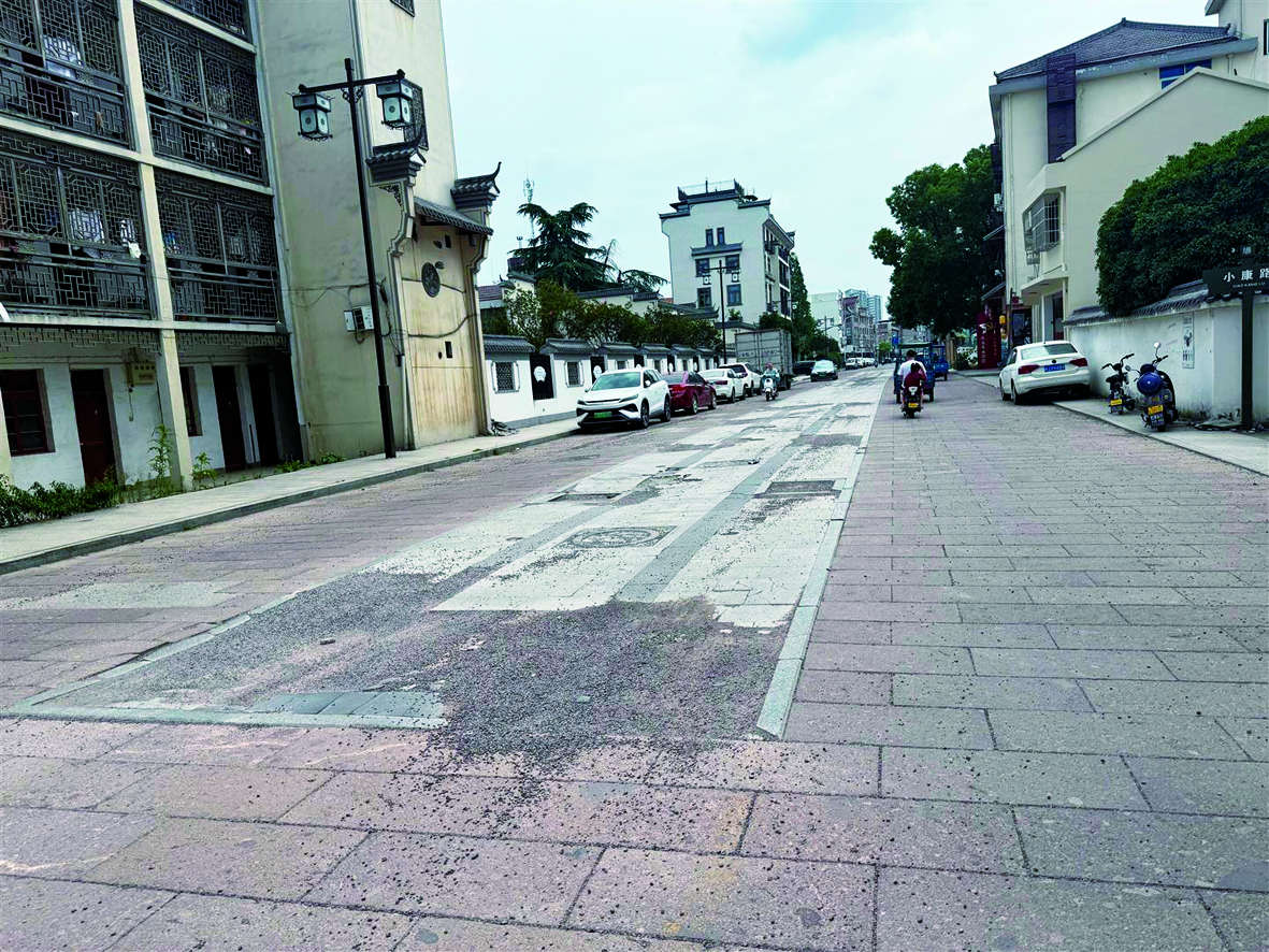 7月16日,记者在黄雾西路路段看到,该道路东西朝向,宽度约有三车道,道路北侧和南侧两车道是由砖石铺成,只有几处小面积破损;中间车道则由两种不同颜色砖石拼接铺成,存在大面积破损,不少区域砂石散落一地,过往行人、车辆都避开中间车道,从南北两车道驶过。