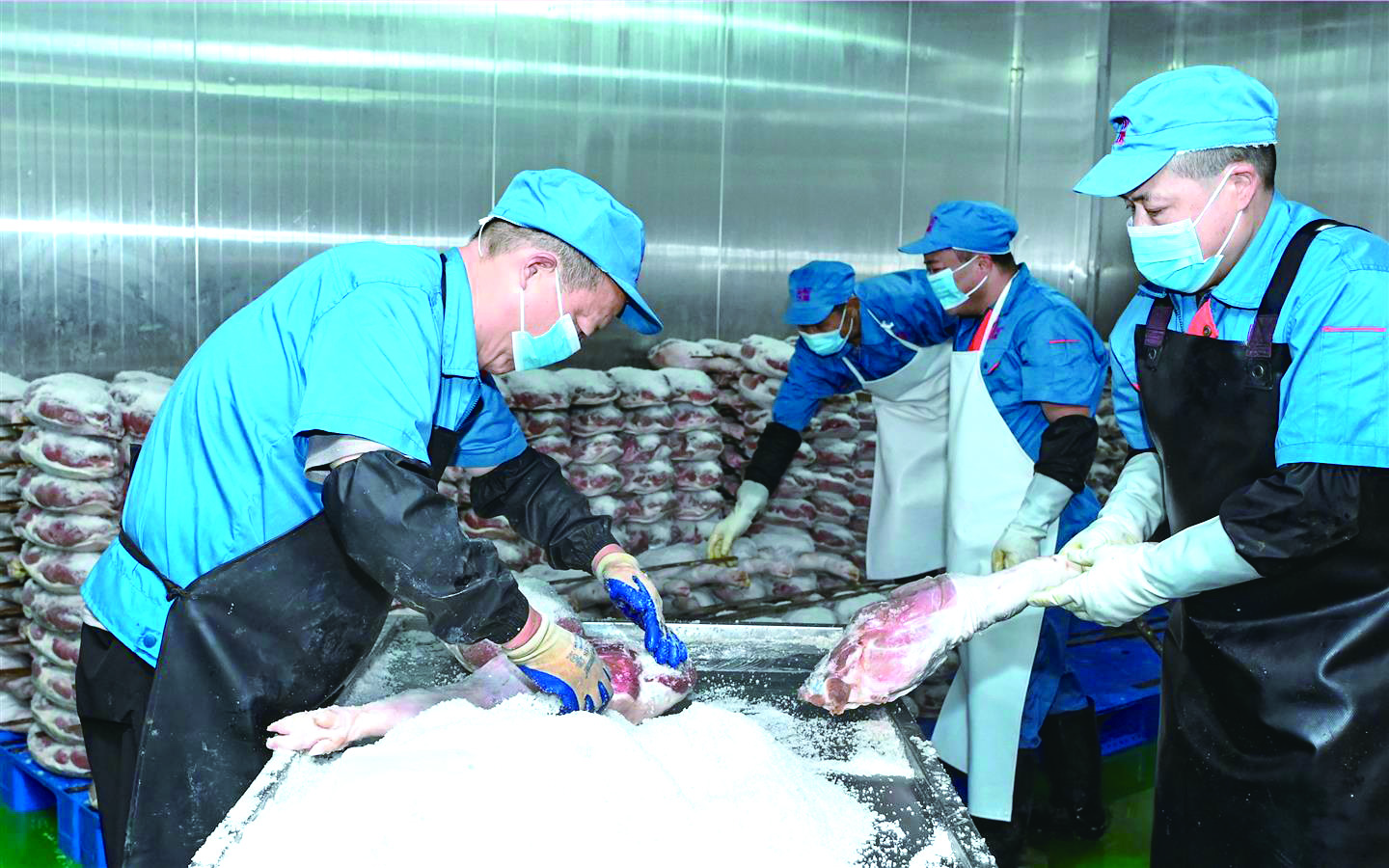 连日来,在金华火腿有限公司控温控湿车间,师傅们忙着腌制火腿。
