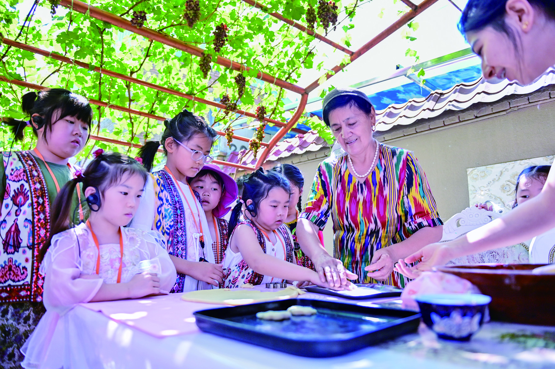 研学游的小朋友在新疆伊犁哈萨克自治州伊宁市伊犁老城喀赞其文化旅游区学做当地特色糕点。 近年来,新疆伊宁市在文旅融合发展上持续发力,让老城重焕生机。当地深挖文化内涵,推动9处文保单位、160项市级以上非遗资源的保护传承,促使手工业向文创产业升级。同时,依托古建筑与特色民居打造“庭院经济”,引导居民改造庭院,培育多样旅游业态,增加就业岗位,让伊宁老城在文旅融合发展中焕发新的活力。新华社发