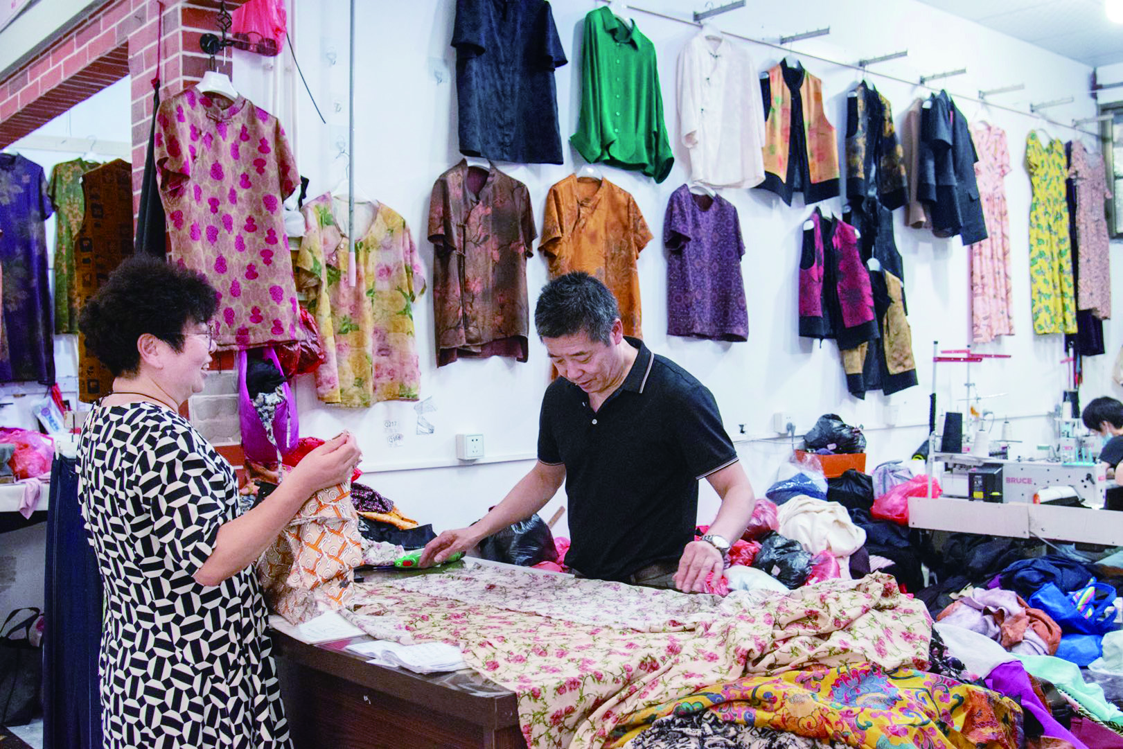 记者 胡肖飞 文/摄 7月25日,市区金华商城服装设计一条街里,裁缝在店铺里裁剪布料、制作新衣。 金华商城服装设计一条街于2010年8月开街。开始时只有零星几家小裁缝店,目前这条街已经有56家裁缝铺,不仅金华本地市民,周边城市顾客也会专门到这里定制自己喜欢的新衣。