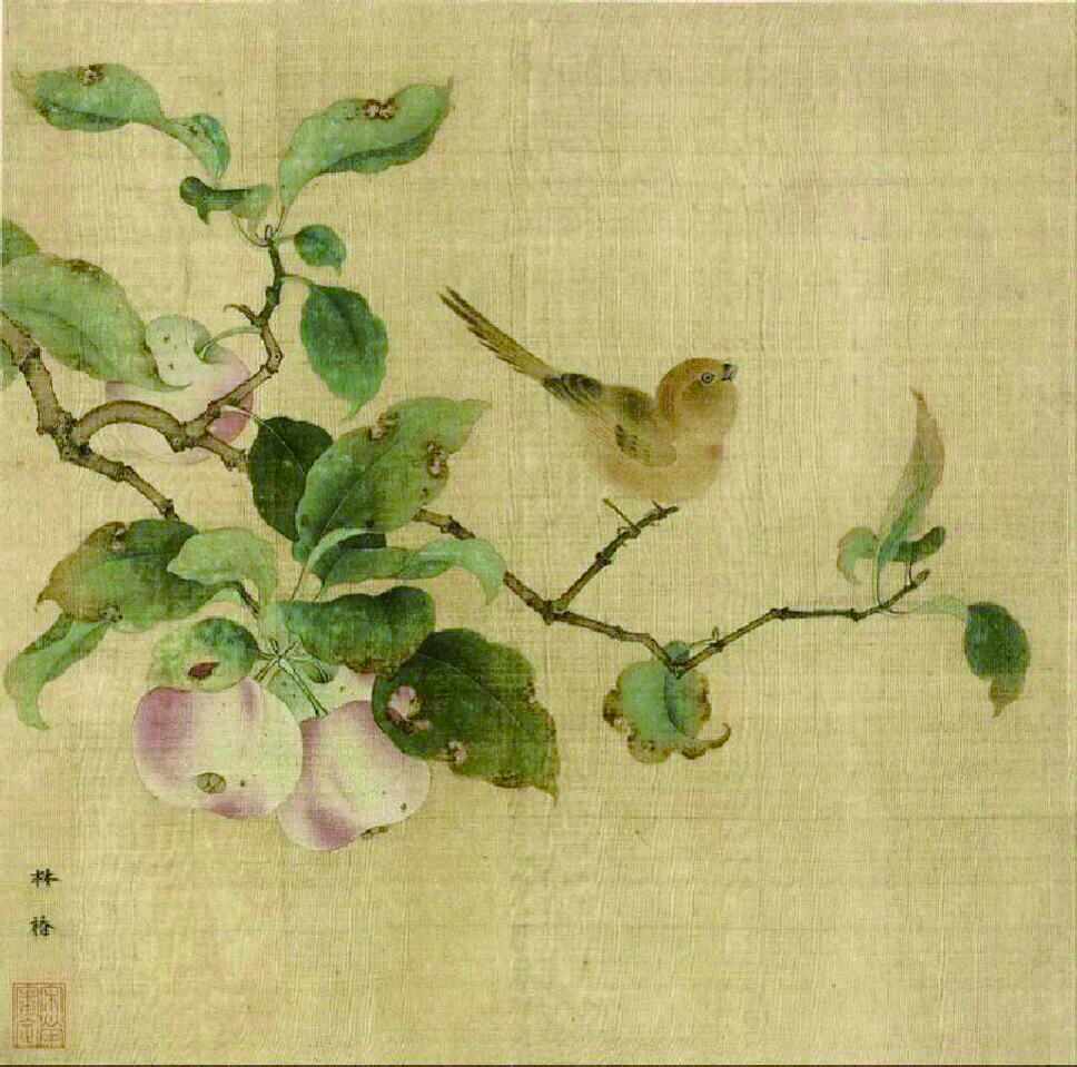 唐代国家音乐机构教坊有《红林檎近》的大曲。到宋代,《红林檎近》又成了词牌名。古时的曲子,今人听不到了,但还可以在画上看,因为林檎入曲,也入画。国画中有花鸟画,画的不仅是花与鸟,也可以是果与鸟,林檎的名字正好符合此意,因此也成为国画的常见题材。林檎果好看,入画,入画的都是红果。宋人林椿有名画《果熟来禽图》传世,用画图很好地解释了林檎的名字。而且,画中的果,也确实很好看如红花。元代钱选在《林檎图》上题诗:“盘簇花红实,南熏更可人。谓云能敌暑,色映绿醪斟。”“花红实”也即花红果,一盘红花一样好看的林檎果,颜色可爱,香气袭人,能解酷暑。